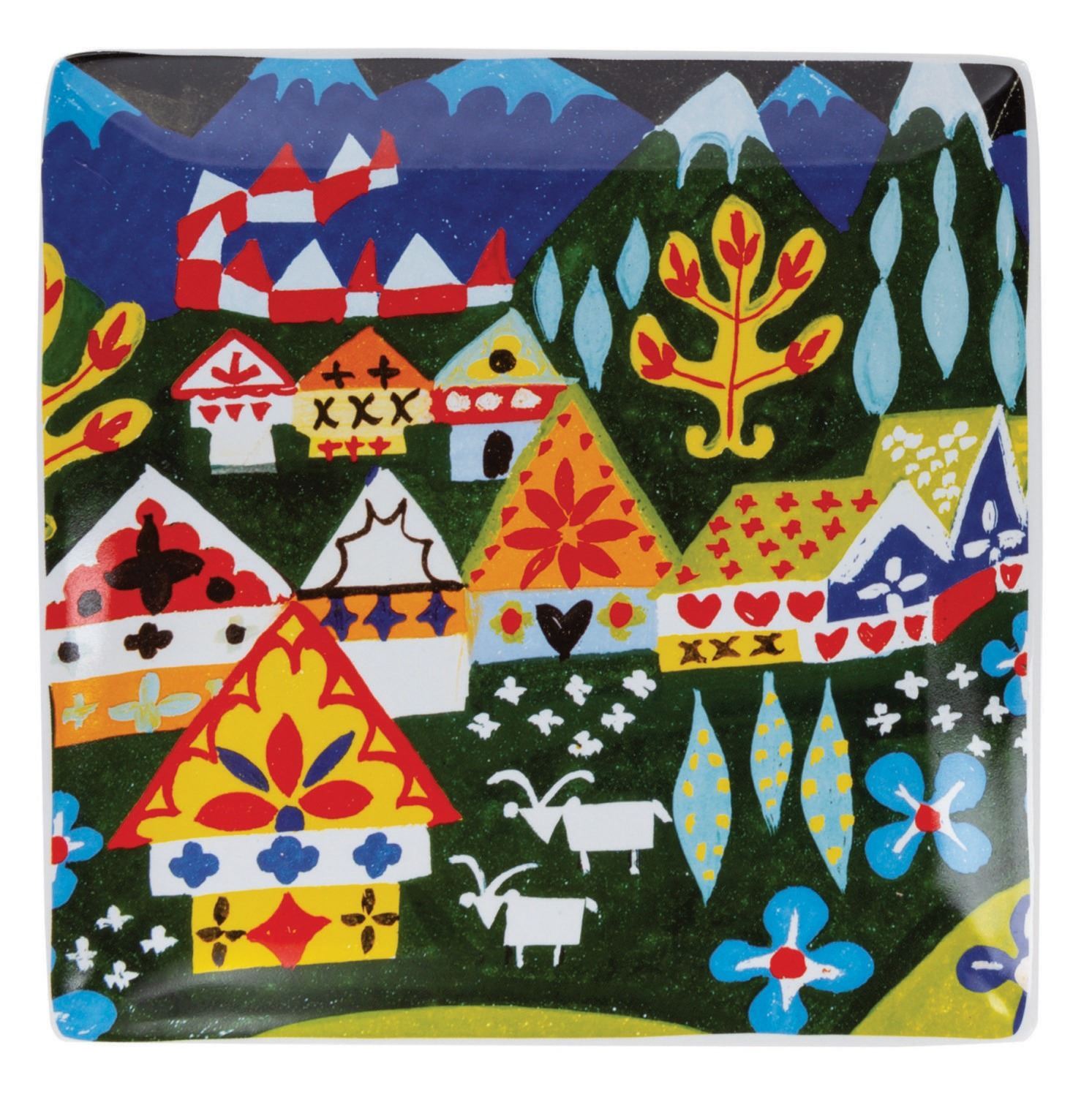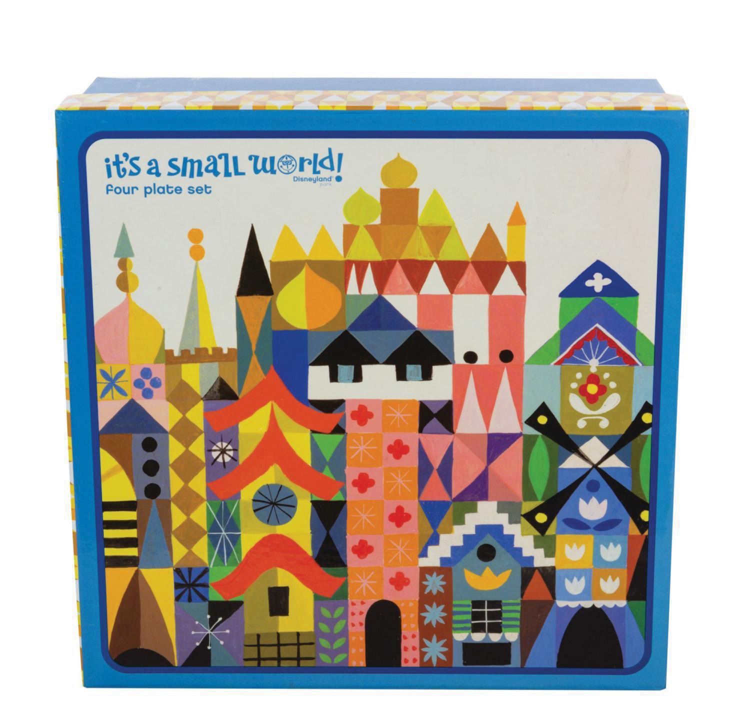 (Disneyland, 2011) A complete set of (4) It's a Small World ceramic plates. Released exclusively at Disney Parks and World of Disney to coincide with the attraction's 45th anniversary, these highly sought after plates evoke Mary Blair's original concept work for the beloved attraction. The square plates measure 8.5"x8.5" and are contained in their original 3.25" tall box. The box lid has minor impressions from storage but is in good condition. The plates show no visible signs of use, though one does have a small chip to its edge. Otherwise they are in very good condition, maintaining their vibrant coloring throughout.