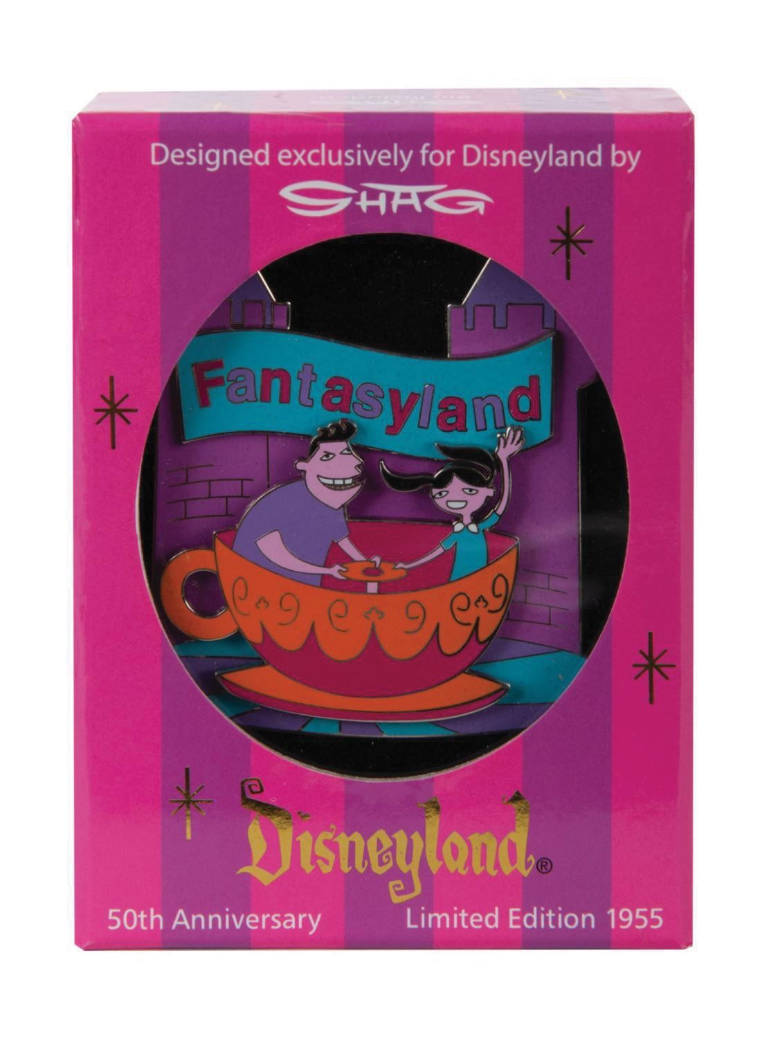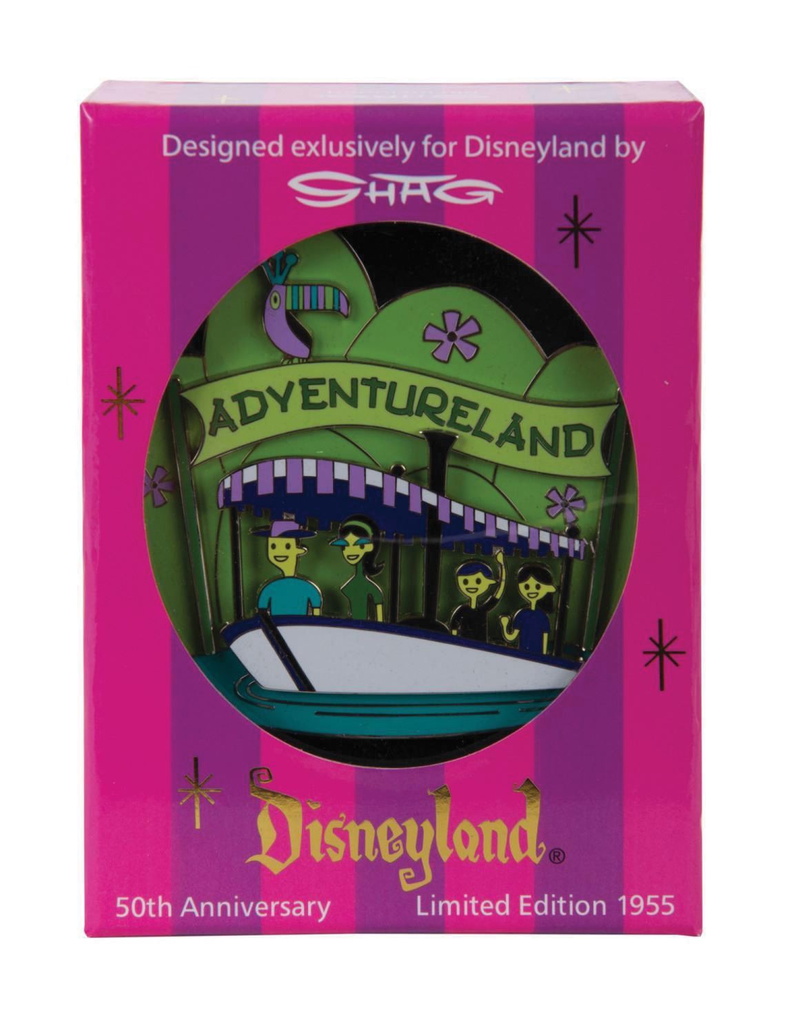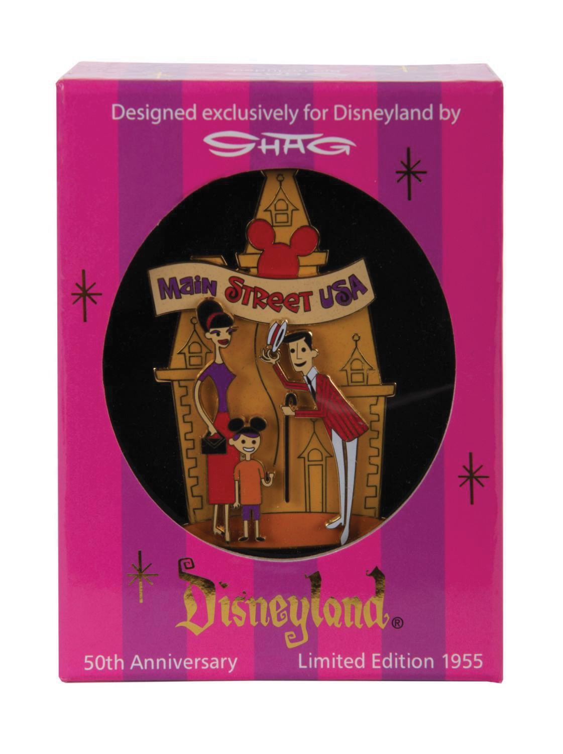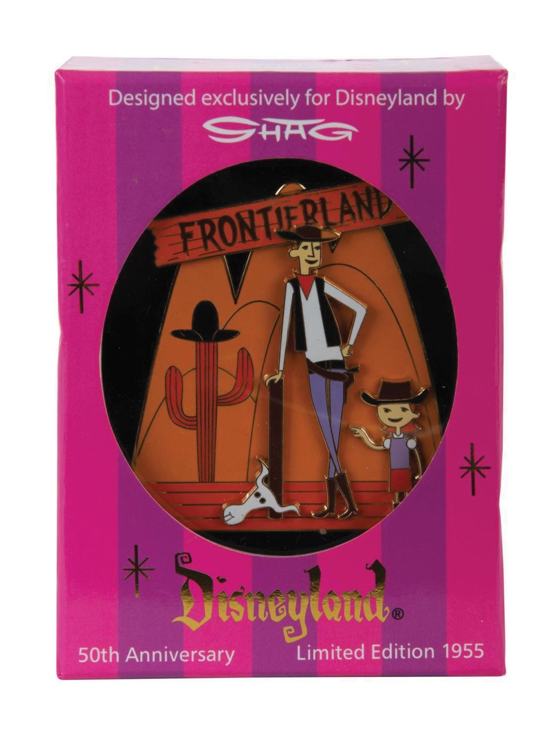 (Disneyland, 2005) A set of (4) limited edition Jumbo pins designed by Shag for the 50th anniversary of Disneyland. The pins of this set are limited to an edition of 1,955, and highlights Main Street, Adventureland, Frontierland, and Fantasyland. Measuring various sizes, each fine condition pin retains original Disney Parks pinbacks, and is displayed in its original window box with artist bio. Measuring 5.5"x4" and 1.5" deep, each candy-striped box is in fine condition with very minor indents, edge wear, and cornering.