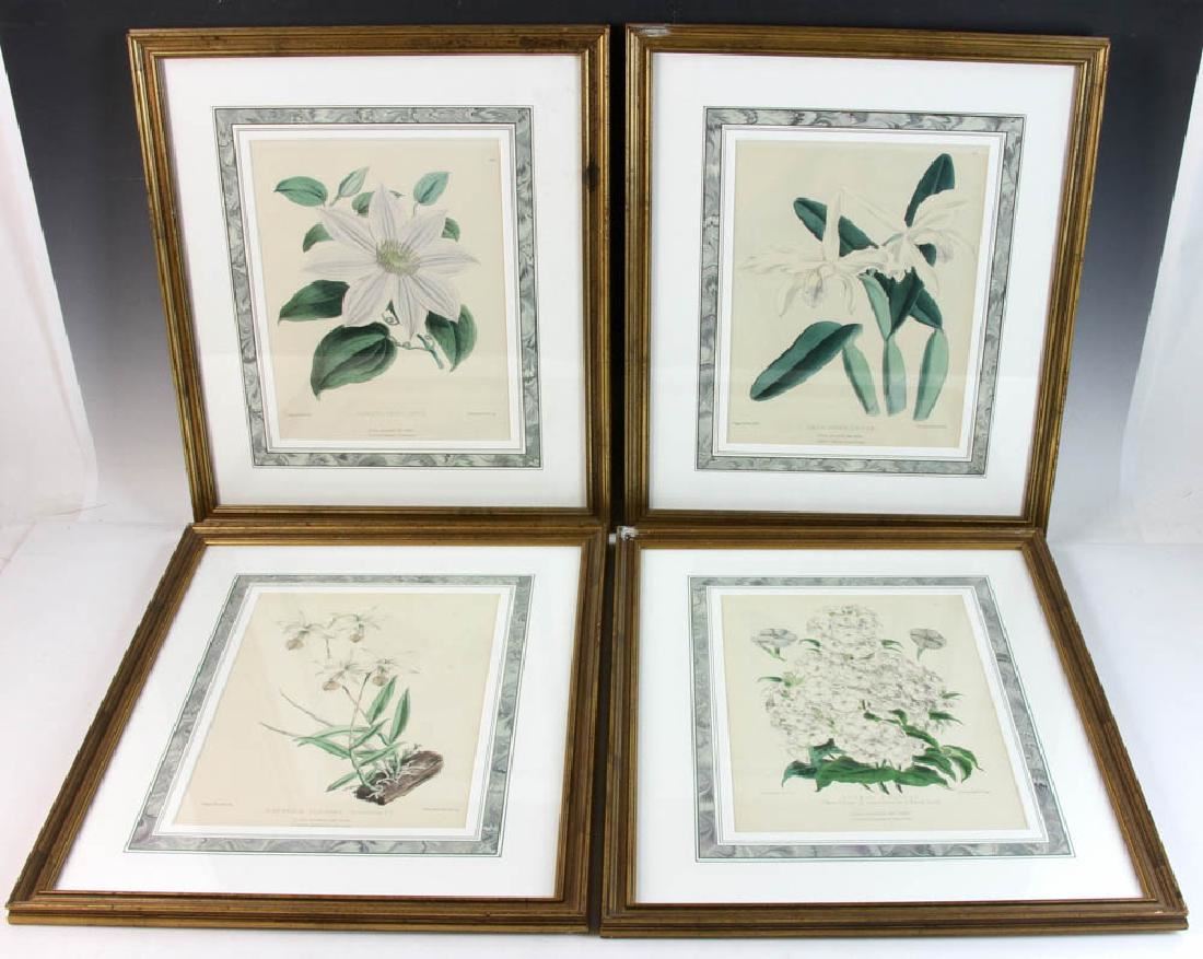 Set of four (4) botanical hand-colored prints, framed 19" x 16". Provenance: Boyton Beach, Florida estate.