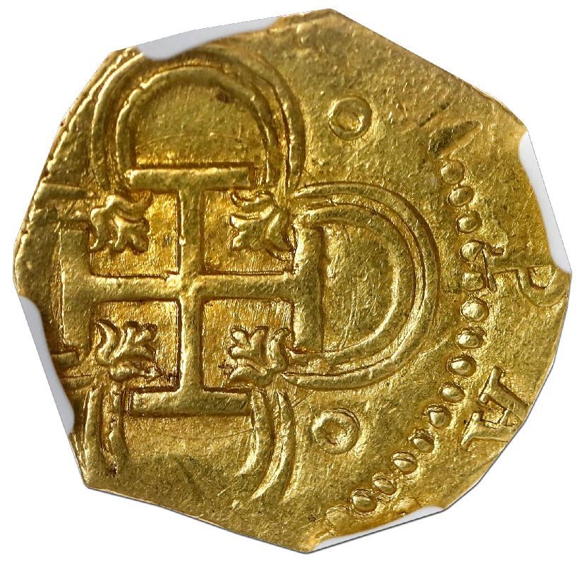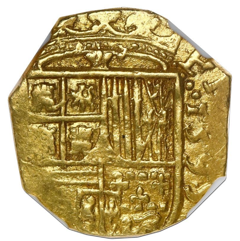 Seville, Spain, cob 2 escudos, 1595 date to right, assayer not visible (B to left below mintmark S), NGC AU 55. Cal-852. 6.72 grams. Choice full shield and cross (both slightly off-center), the former with much crown above and full date to right, somewhat lustrous, just a few incidental marks. NGC #4916884-003.