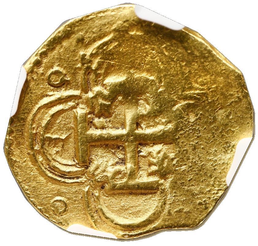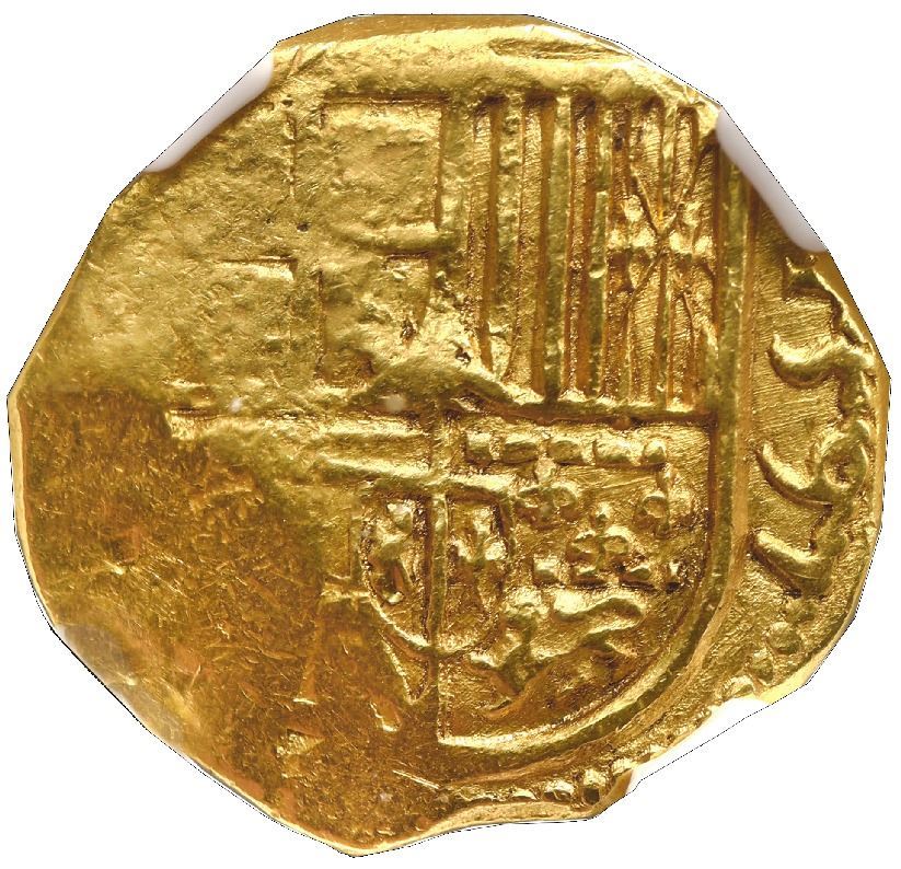 Seville, Spain, cob 2 escudos, 1597 date to right, assayer not visible (B or V to left below mintmark S), NGC AU 55, finest known in census. Cal-857. 6.71 grams. Nearly full and well-detailed cross and shield with one side flat (as made), other side with full and bold date 1597, the best of just three in the NGC census (one with assayer visible). NGC #4916882-001.