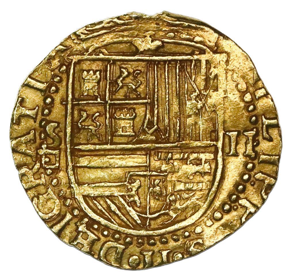 Seville, Spain, cob 2 escudos, Philip II, assayer Gothic D below mintmark S to left. Cal-Type 257. 6.69 grams. Typically choice full inner details (AU) and much legend, mount removed from top edge.