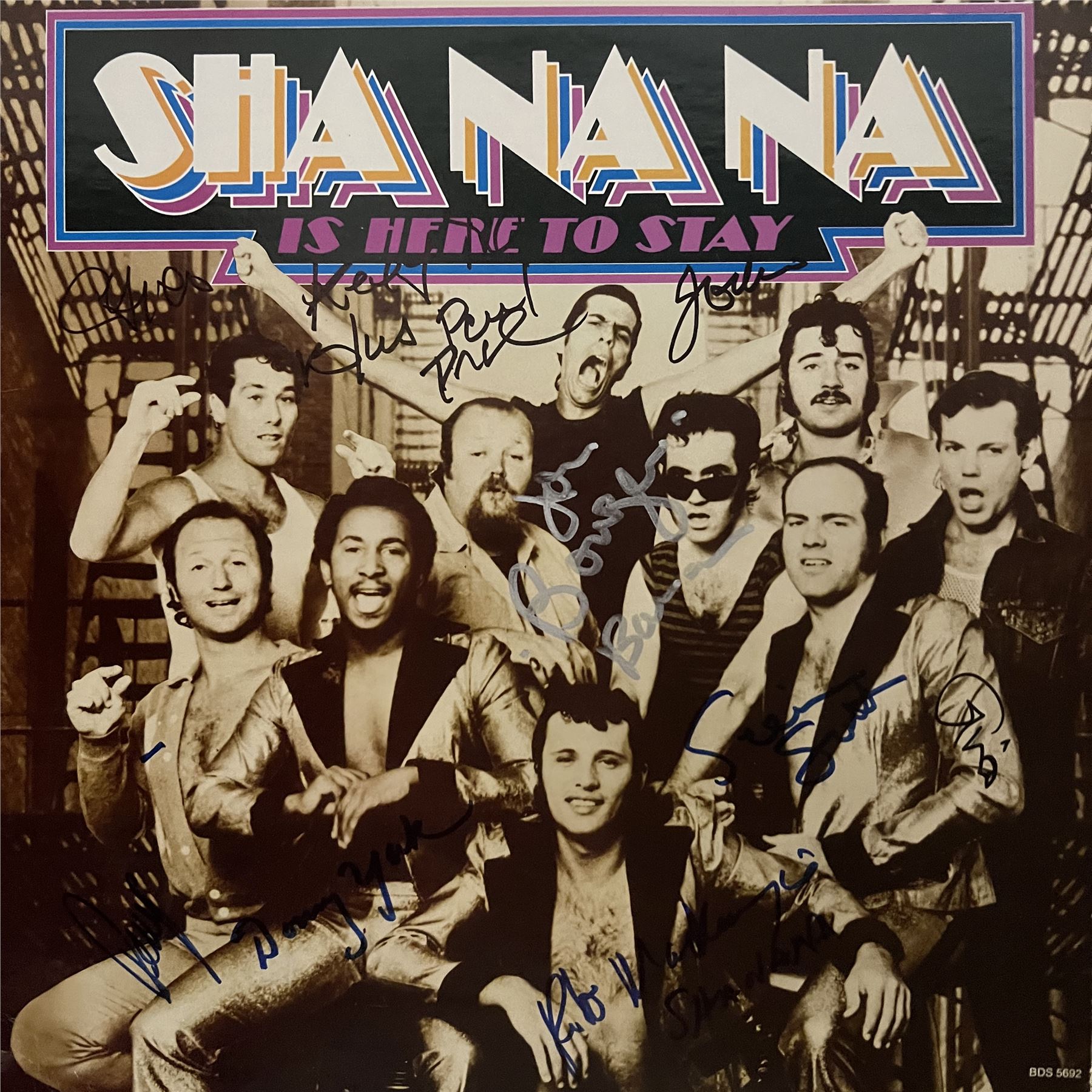 Sha Na Na Is Here To Stay signed album autographed by Jon Bauman, Scott Simon, Donald York, Rob McKenzie, John Cantardo and Lennie Baker. 12x12 inches vinyl included