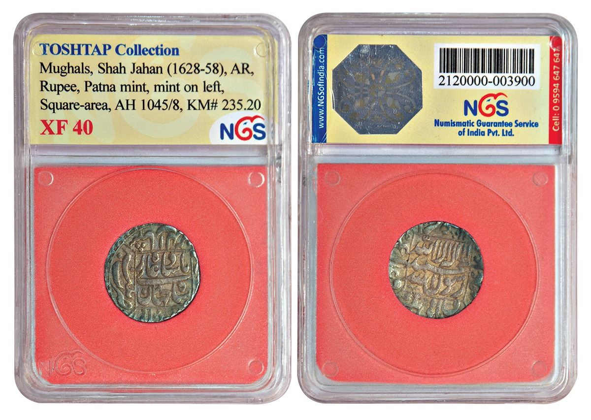 Shah Jahan (1628-1658 AD), silver rupee, Patna mint in left quadrant, AH 1045/RY 8, KM 235.20.