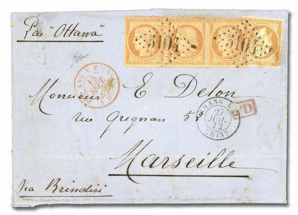 Shanghai, 1872 July 27, lovely Custom House Shanghai cover, sent to Marseille, France, a pretty blue envelope endorsed Par Ottawa and Via Brindisi, addressed to Monsieur E. Delon, and franked by 10c Napolon and horizontal strip of three 40c Crs for a total of 1F30; adhesives cancelled by two nice 5104 diamonds, with black Shang-Ha/27/JUIL/72/Chine origin below; front additionally shows red boxed PD handstamp and red Paq. Ang. V. Brind./15/SEPT/72/A Mod entry c.d.s.; reverse bears solid strike in red of Custom House/PAID/27. JUIL/1872/Shanghai oval datestamp, plus light, illegible struck over seal French receiver; fold split on opening of absolutely no consequence, Very Fine, an exquisite example of a very scarce marking.
