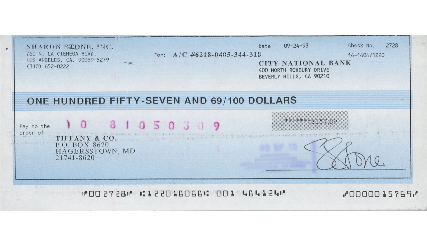 Sharon Stone signed check