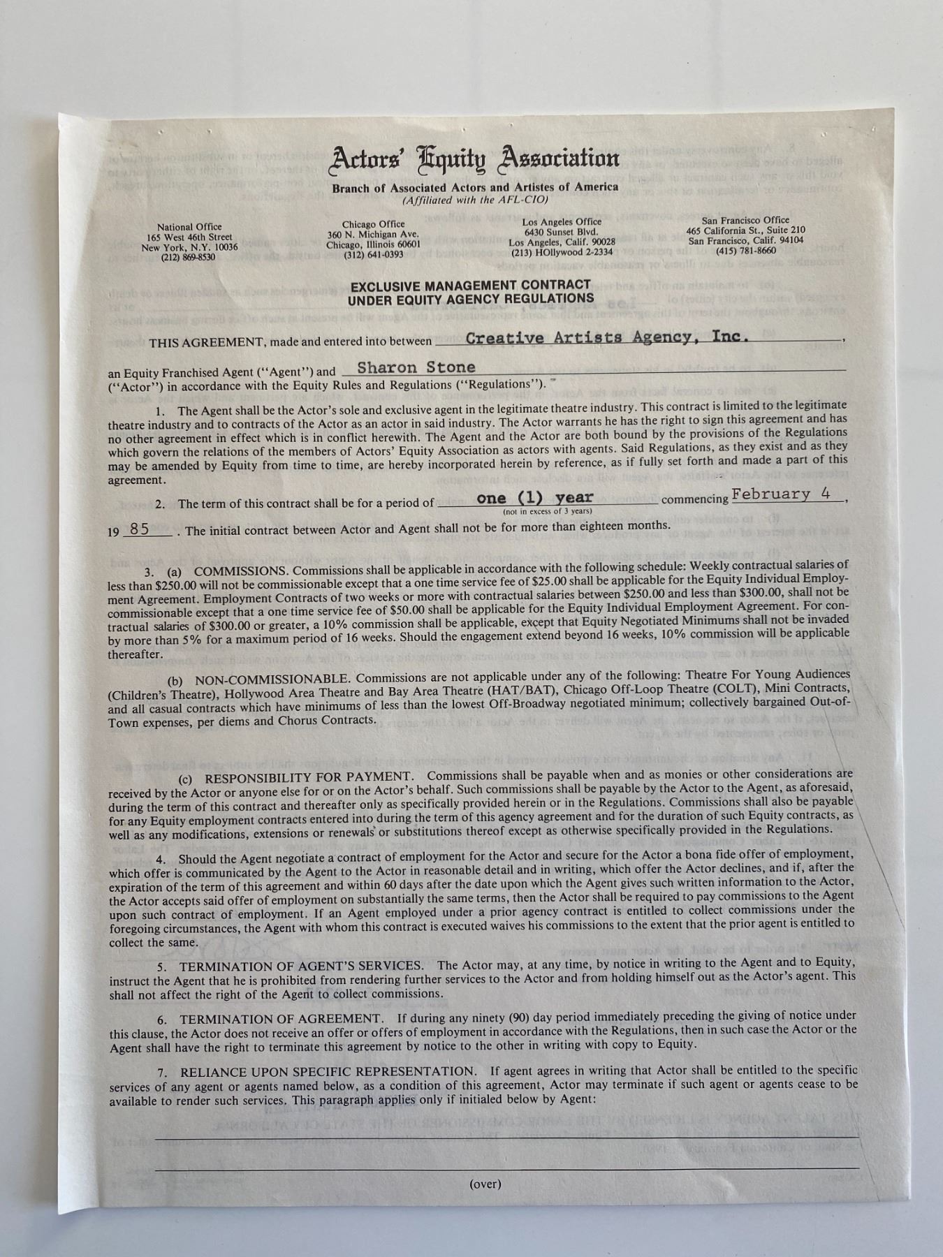 Sharon Stone signed document-Creative Artist Agency contract-Feb 4 1985. 9x11 inches