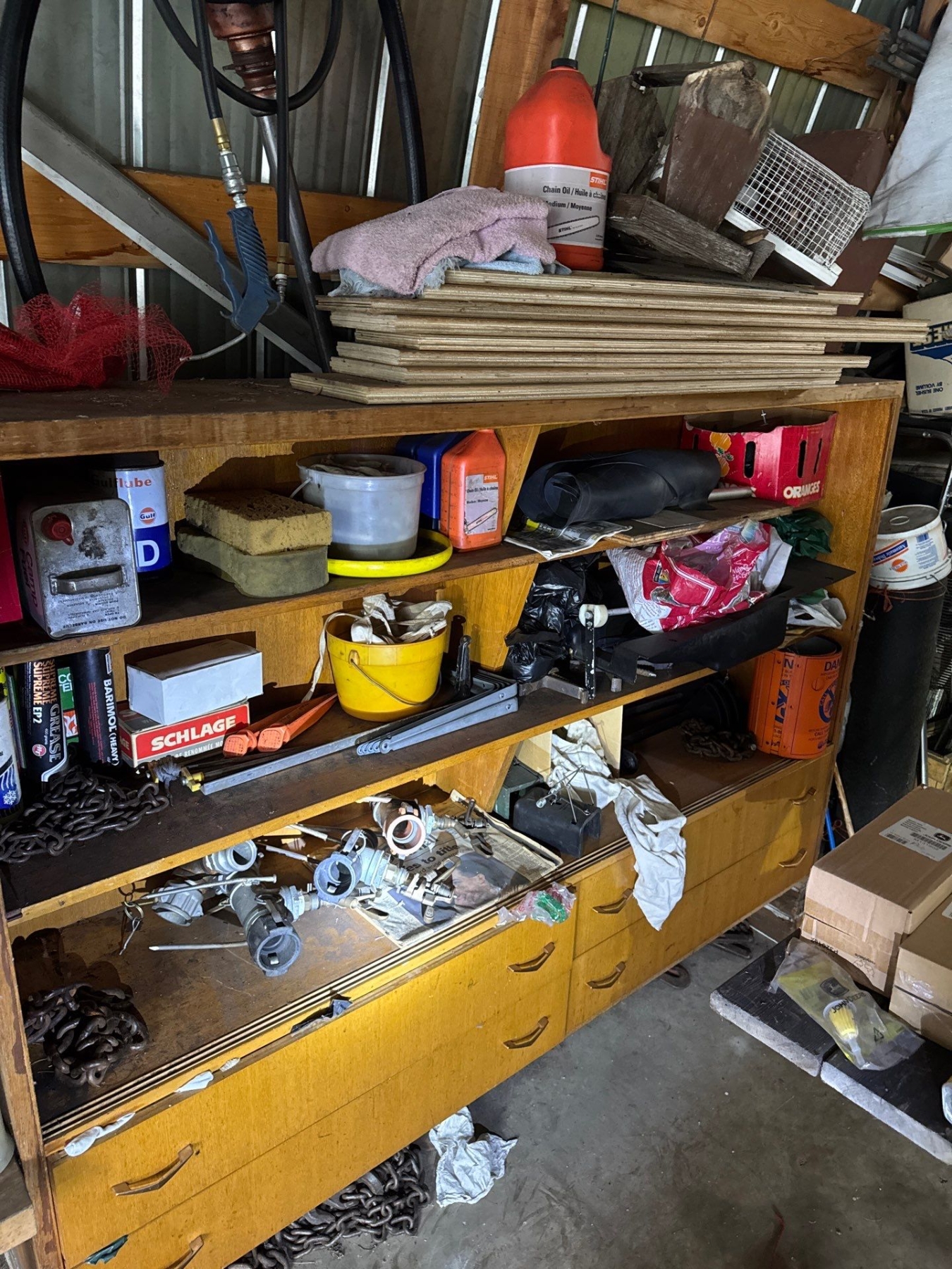 Shelving unit with chains, various items, chainsaw bar oils, camp fuels, unknown items in drawers. u