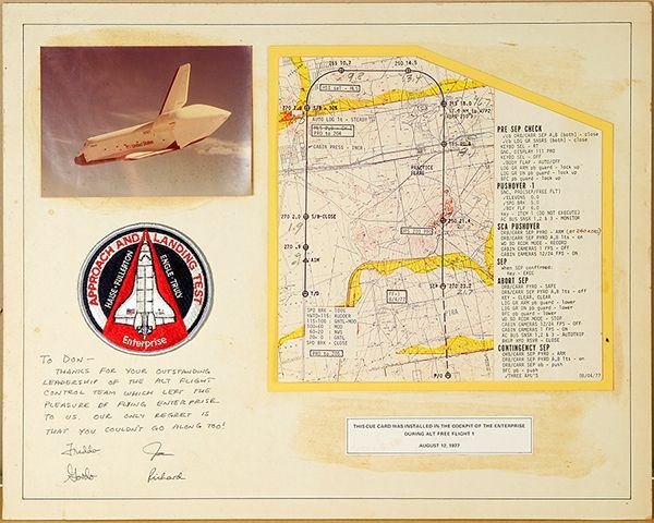 Shuttle Alt Flown Cue Card From Free Flight 1. A nice display presented to Donald Puddy for his work on the ALT program. The handwritten inscription reads, "To Don � Thanks for your outstanding leadership of the ALT flight control team which left the pleasure of flying Enterprise to us. Our only regret is that you couldn�t go along too!" The printed inscription reads "This cue card was installed in the cockpit of the Enterprise during ALT Free Flight 1, August 12, 1977". The piece measures 16 x 20", the cue card is approximately 10 x 10" and appears to show Enterprise�s flight path. There is also a mission patch but no indication that it was flown. Some overall discoloration of the background especially where adhesive appears to have been applied while mounting the various items. Ex. the Donald Puddy Estate collection.