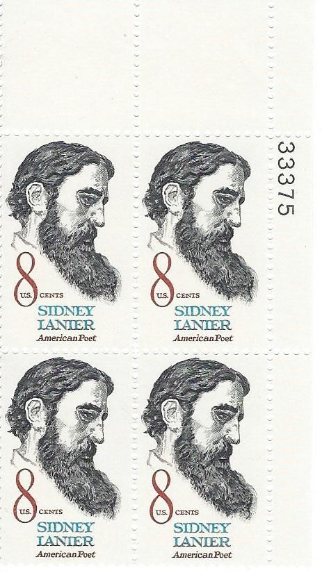 Sidney Lanier American Poet Plate Block of 4 x 8 Cent US Postage Stamps, Scot 1446. Born in Macon, Georgia, Sidney Lanier was a teacher at Johns Hopkins University and an American poet noted for writing about the beauty of the American South. Lake Sidney Lanier, located on the Chattahoochee River in northern Georgia, is named in his honor. This stamp was issued in Lanier’s hometown on the anniversary of his birthday.
