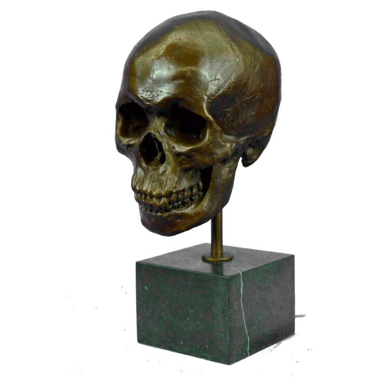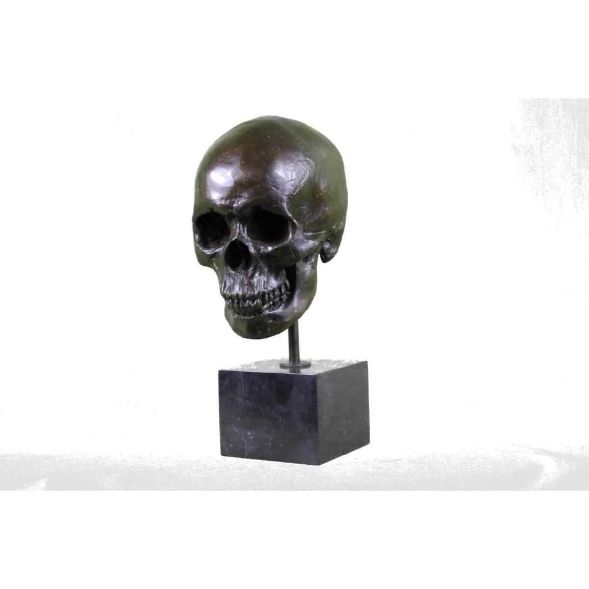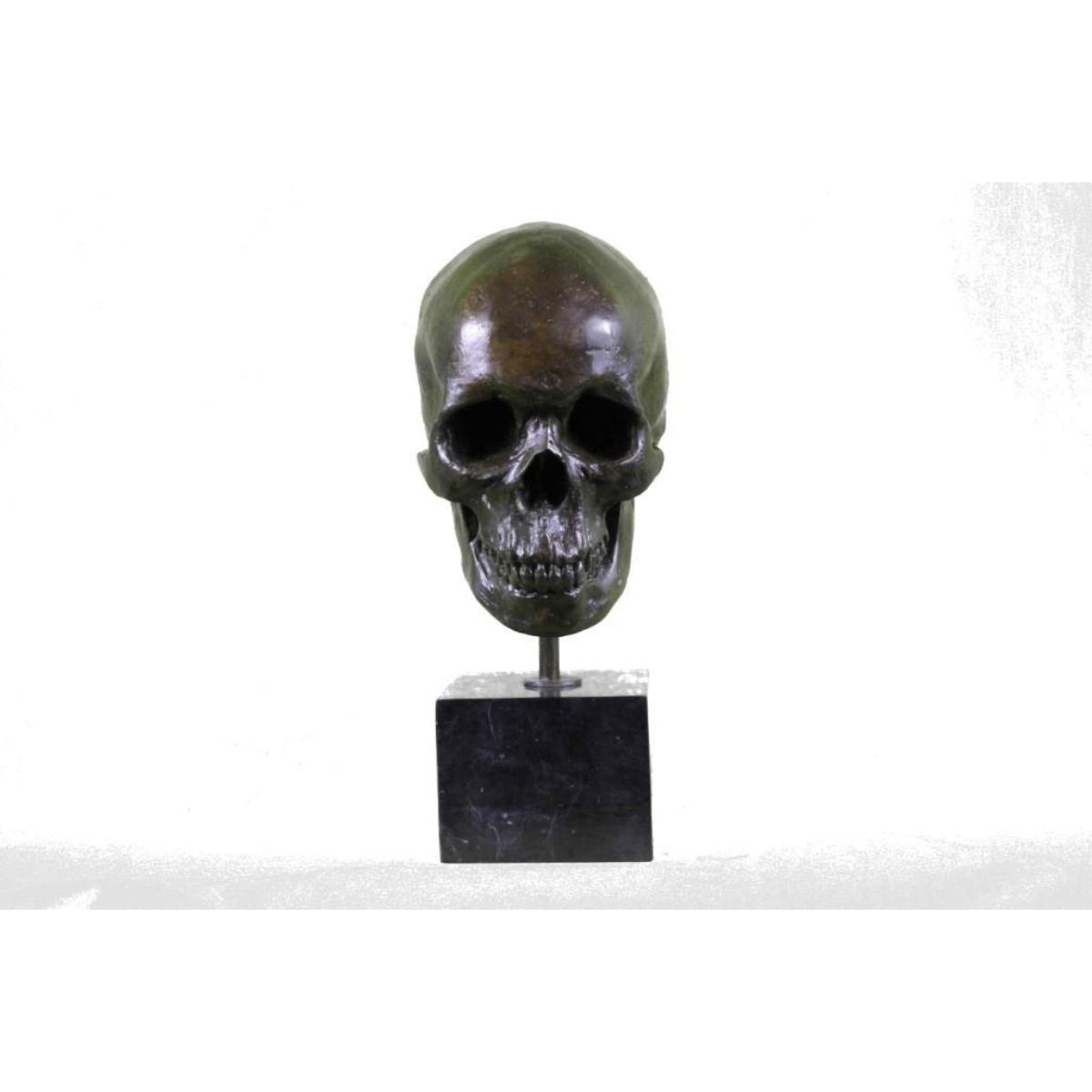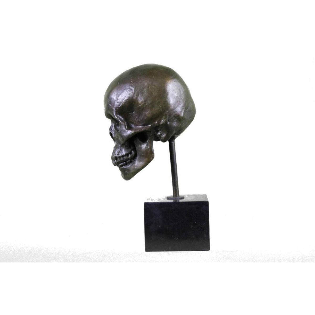 Total Dimensions: Height 14'' x Width 7'' Approximate Weight: 16 LBS Original Reproduction: Reproduction This is the creepiest yet most interesting at the same time sculpture. For the people that love Halloween or simply find weird and unique things beautiful this one is for you guys. I guess they say you don`t have to be gorgeous to be beautifully nice, with a piece of art like this one you will start a conversation up with anyone. This skeleton skull is your typical skull, I personally find it fascinating just because it has all its teeth in. This skeleton is casted using the ancient old "Lost Wax Method" stained in a resin off white or gray patina. 100% handmade and 100% bronze. This sculpture is mounted atop a black marble base and signed .