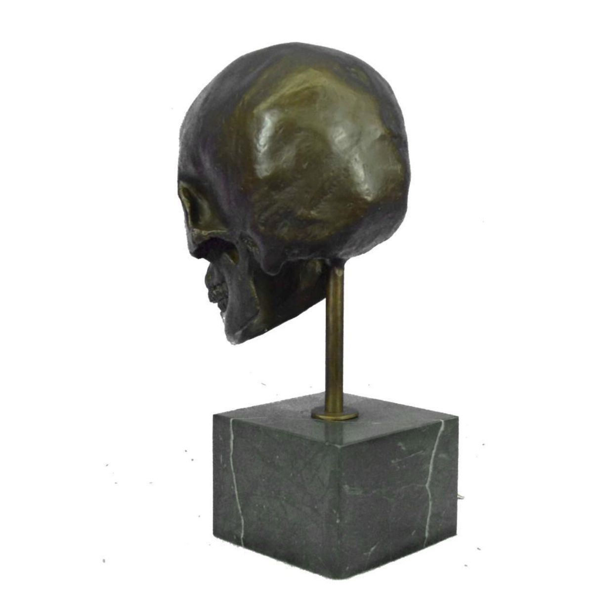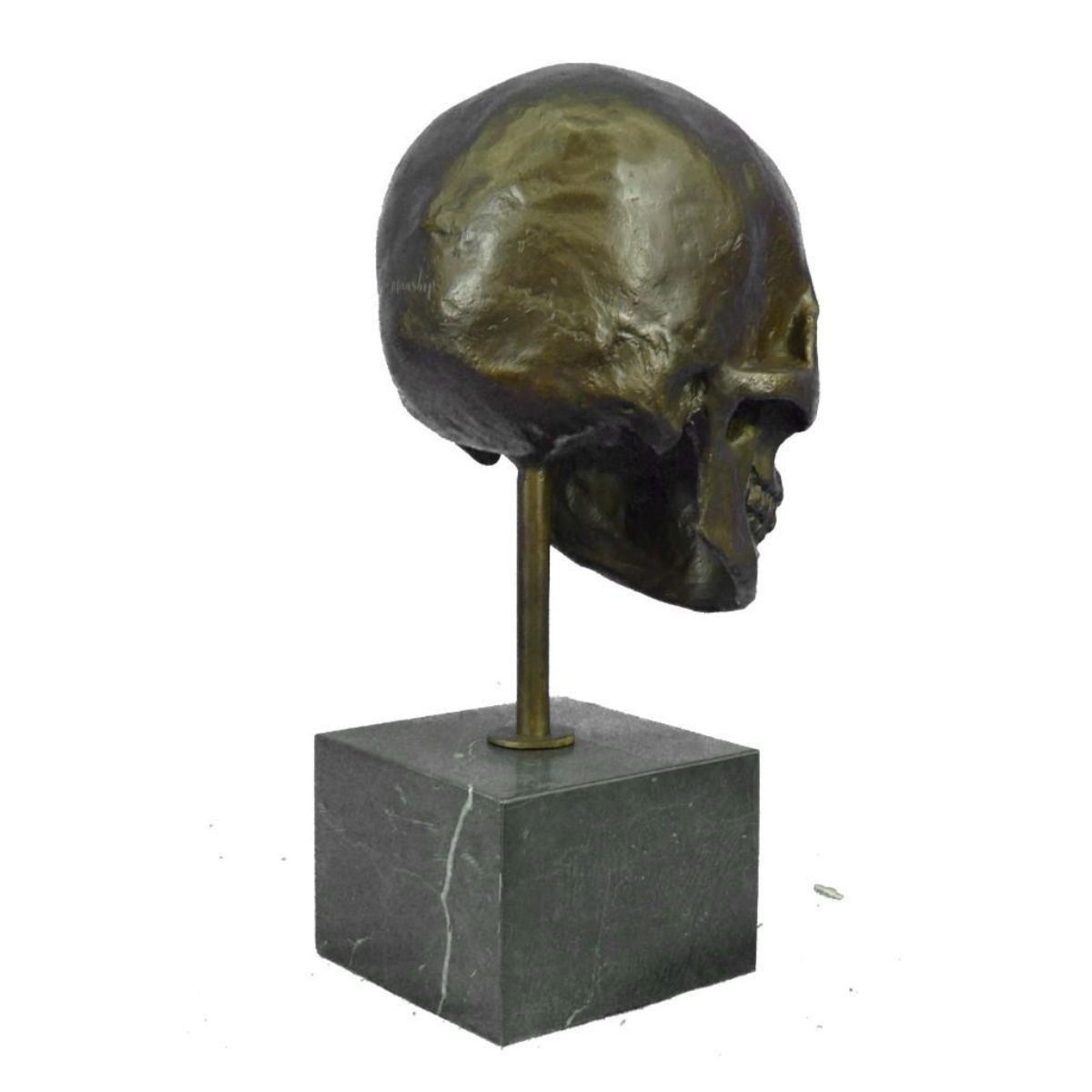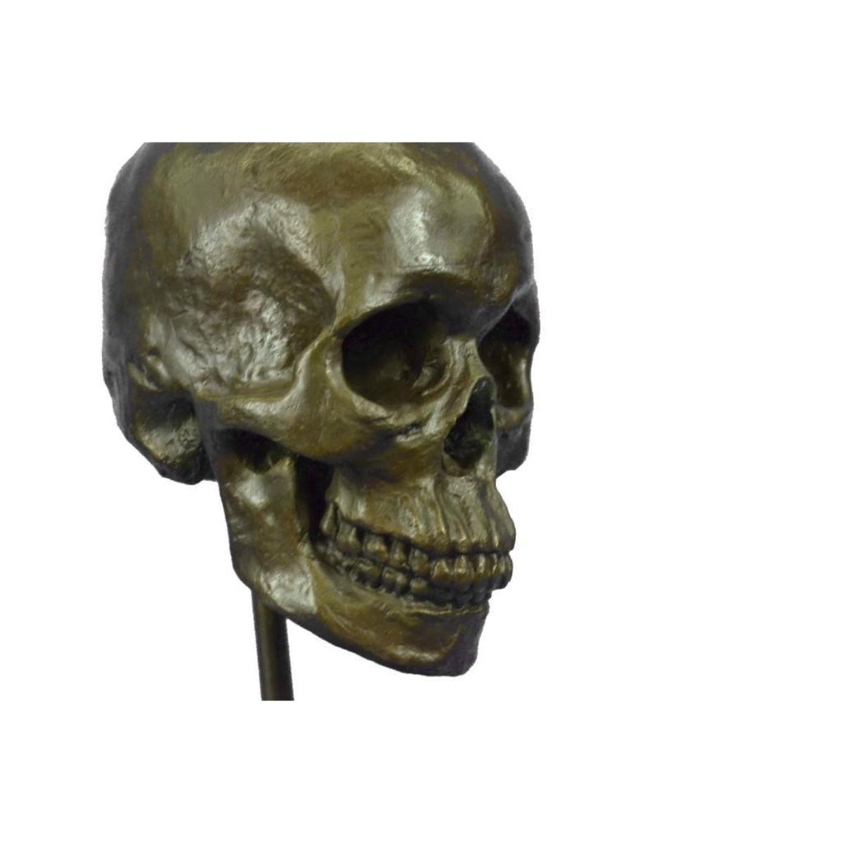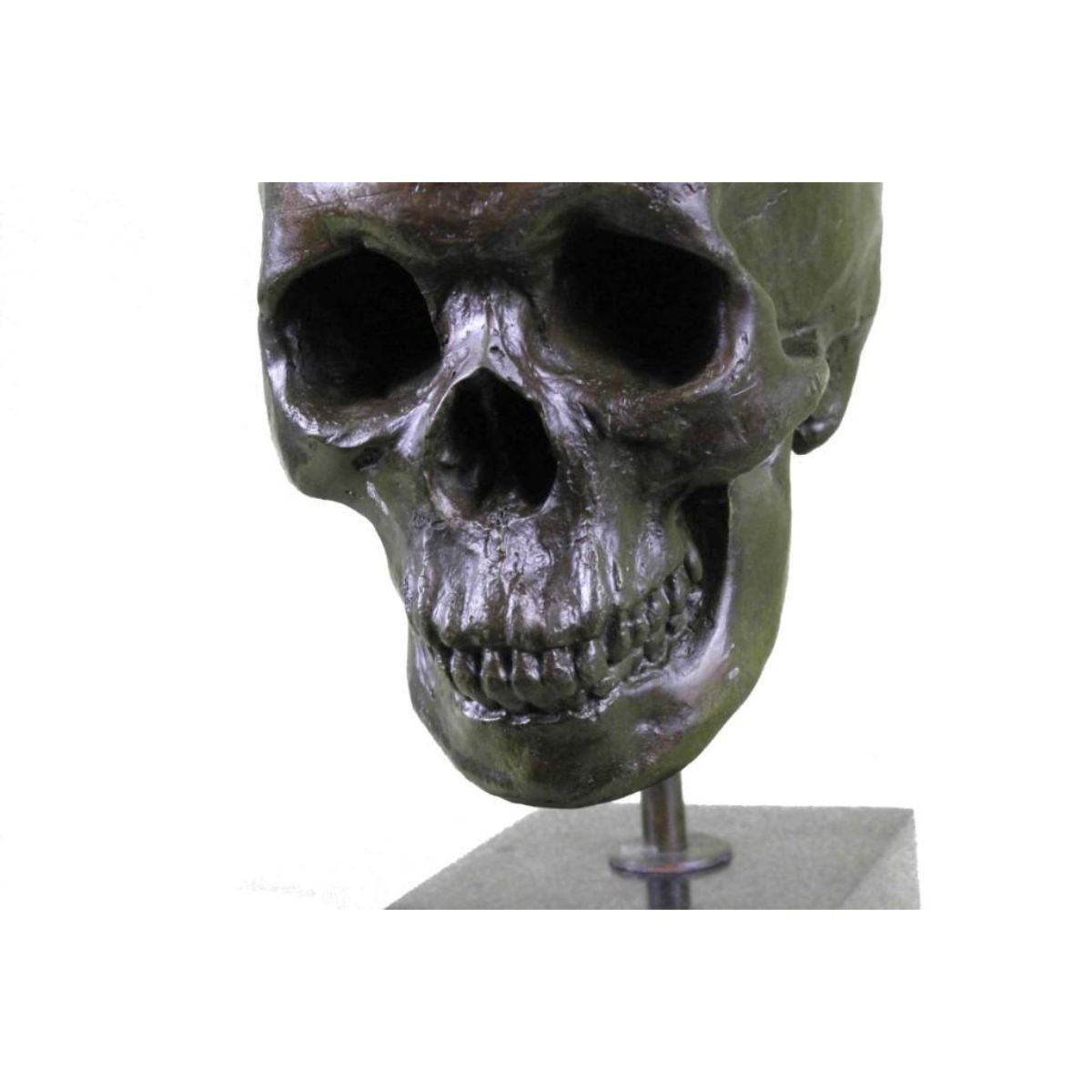 Total Dimensions: Height 14'' x Width 7'' Approximate Weight: 16 LBS Original Reproduction: Reproduction This is the creepiest yet most interesting at the same time sculpture. For the people that love Halloween or simply find weird and unique things beautiful this one is for you guys. I guess they say you don`t have to be gorgeous to be beautifully nice, with a piece of art like this one you will start a conversation up with anyone. This skeleton skull is your typical skull, I personally find it fascinating just because it has all its teeth in. This skeleton is casted using the ancient old "Lost Wax Method" stained in a resin off white or gray patina. 100% handmade and 100% bronze. This sculpture is mounted atop a black marble base and signed .