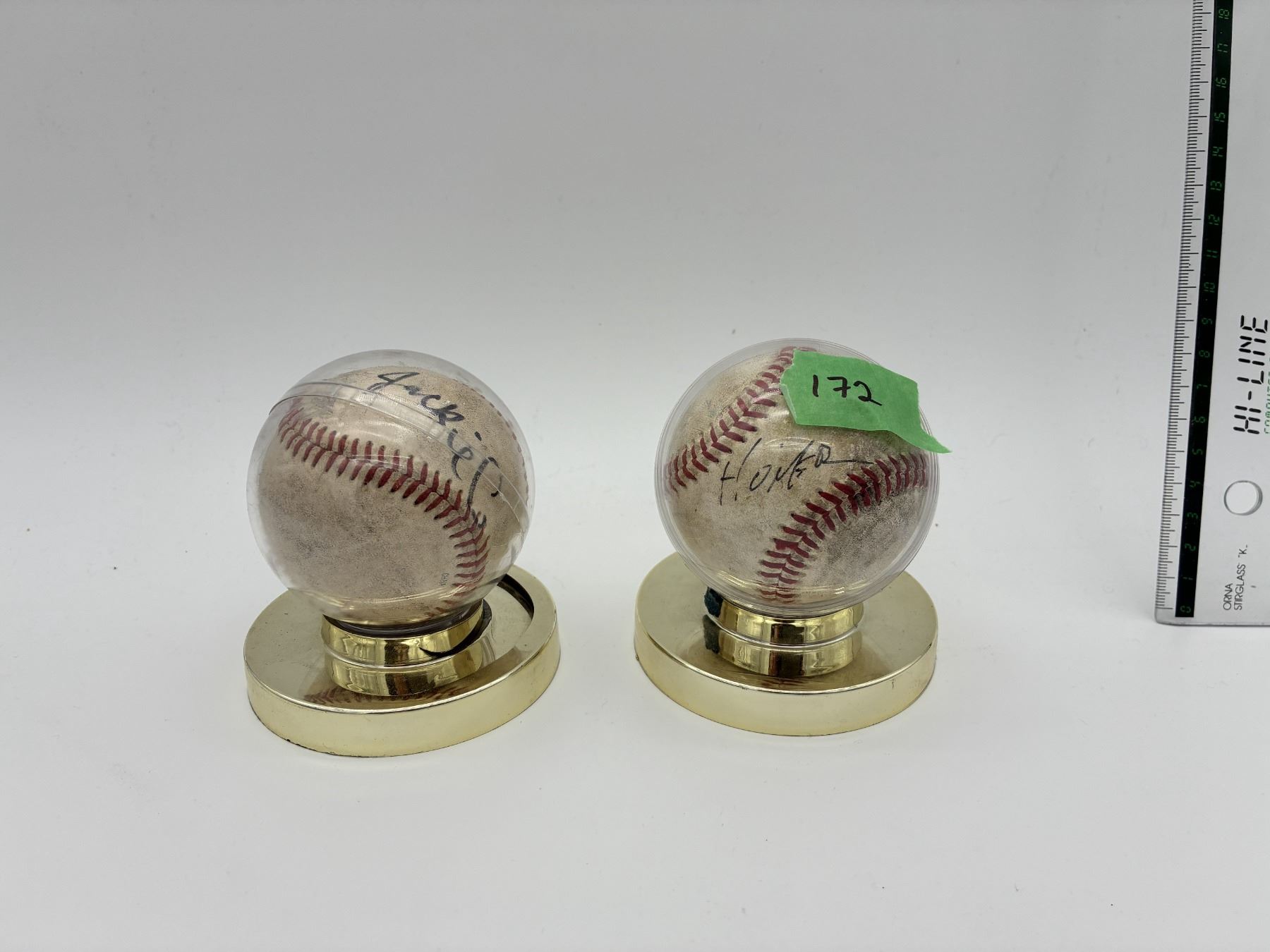 Lot of 2 autographed baseballs. Signatures not authenticated. Display pieces.