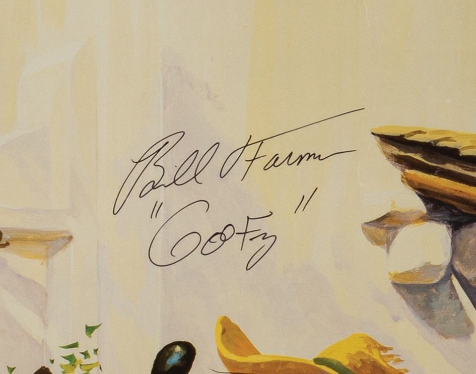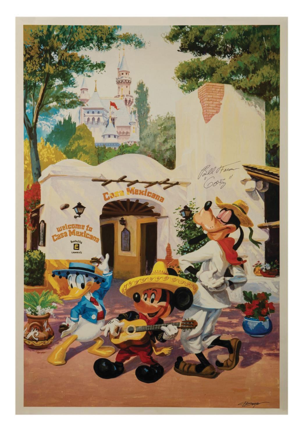 (Disneyland, c.1985) A beautiful "Fiesta Mexicana" lithographic print signed by its artist Charles Boyer as well as voice actor Bill Farmer. A trio of mariachi (Mickey Mouse, Goofy, and Donald Duck) celebrate new Disneyland Casa Mexicana Participant Lawry's. Measuring 32.25"x22.25", the print is in very good condition with minor handling wear and creasing along the right side.