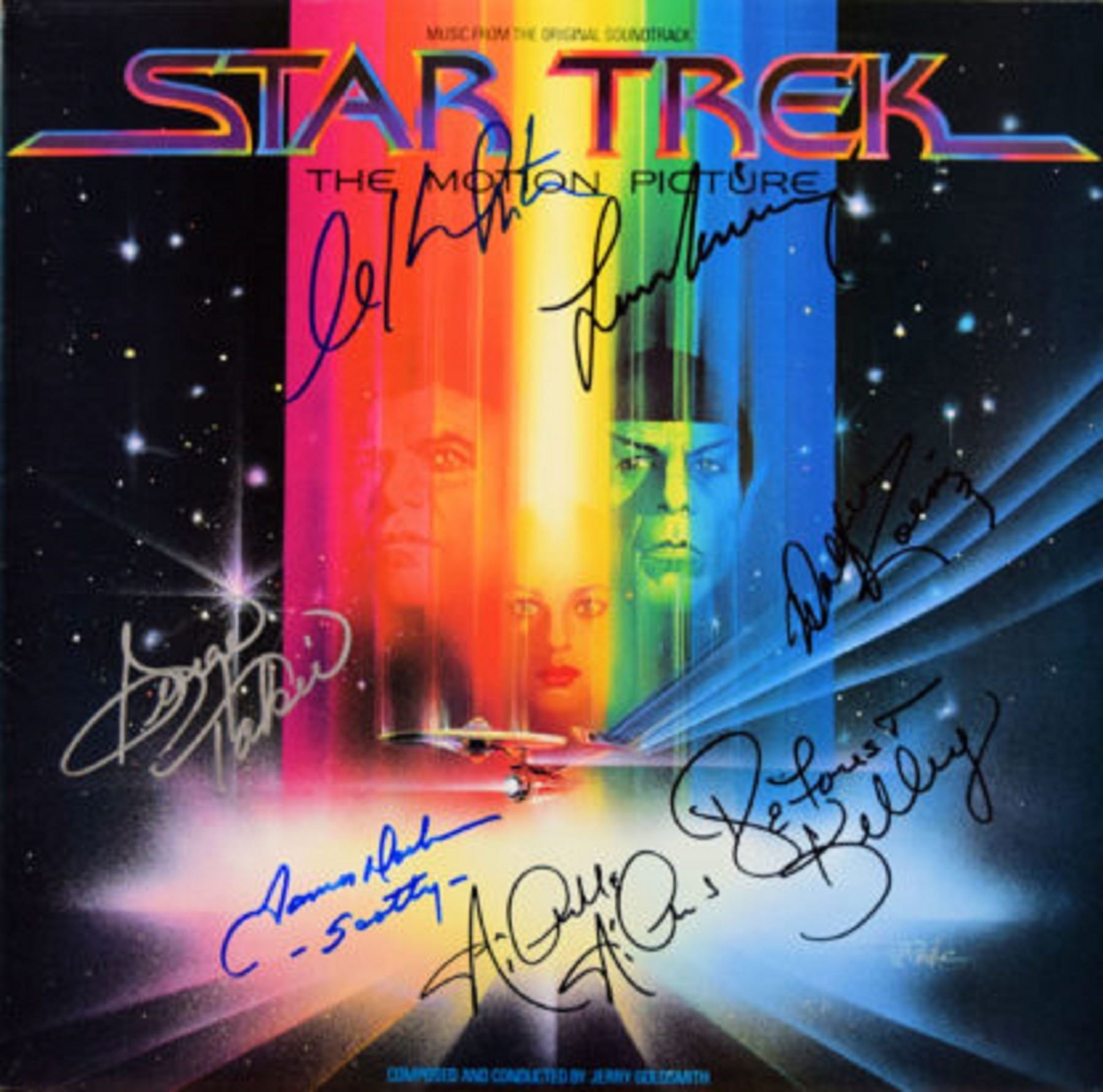 1979 original music to the motion picture Star Trek. Signed: Leonard Nimoy, George Takei, William Shatner, DeForest Kelley, James Doohan -Scotty-, Walter Koenig, and Nichelle Nichols