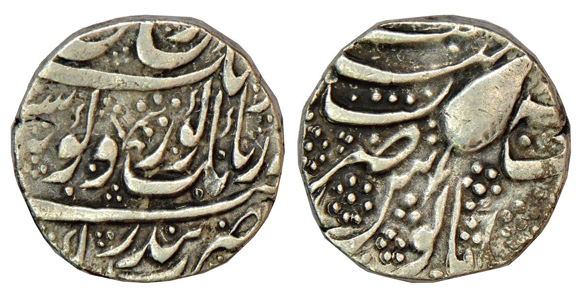 Sikh Empire, Governor Diwan Moti Ram (end of 1819-1820 AD), silver rupee, Khitta Kashmir mint, 'Gobind Shahi’ couplet, VS off flan (1877-1878), sprig mintmark on obverse, Herrli 06.03.04, 10.90g.