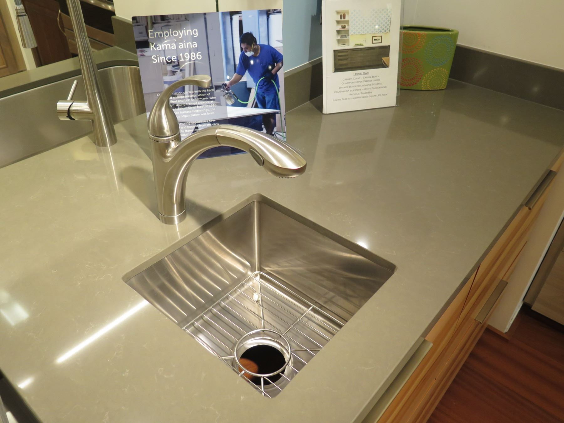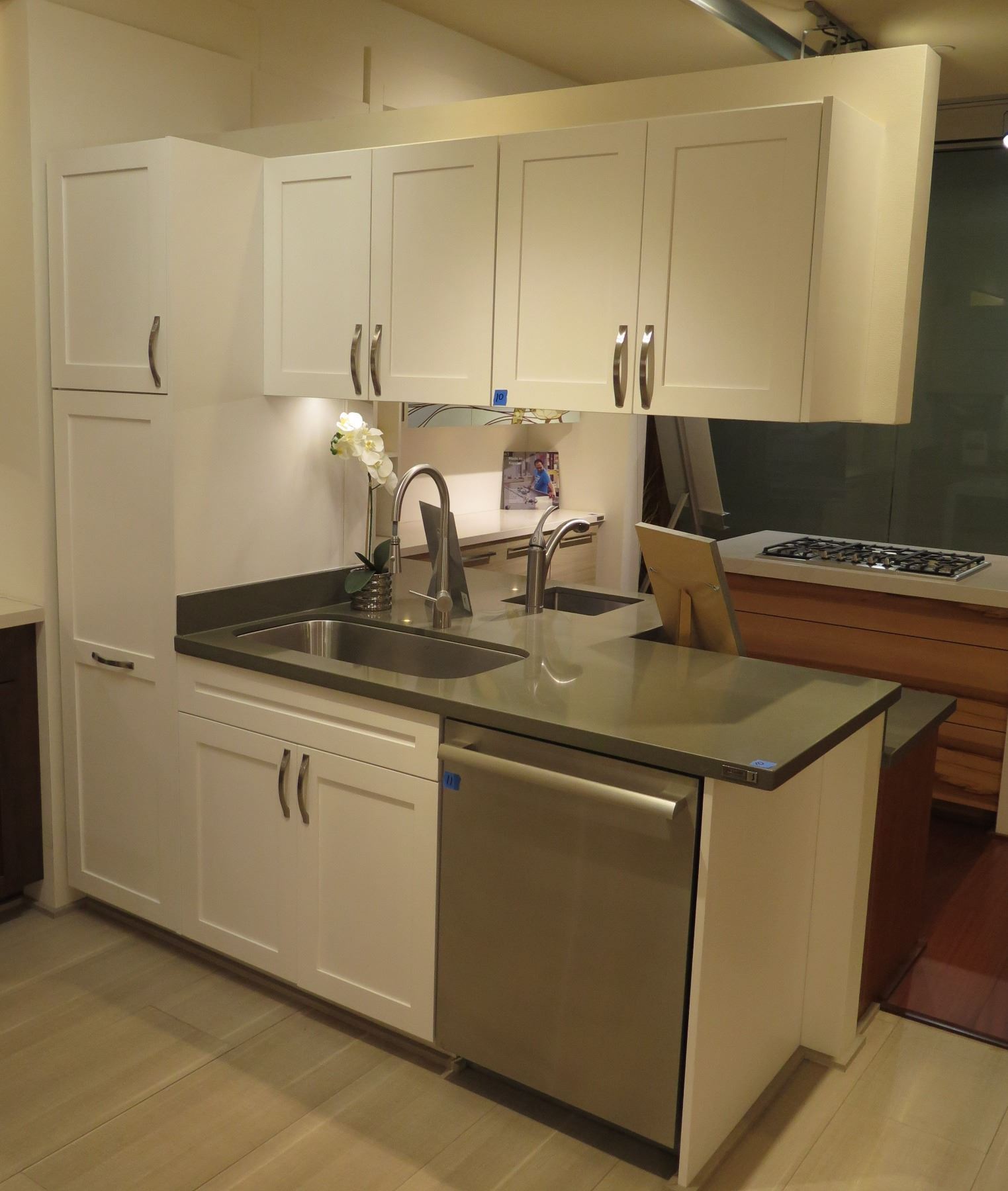 Double-Sink Grouping: Shaker White Painted Cabinets (including tall Hafele pull-out pantry on left), Silestone Altair Counter, Eclipse 3018 Napa Sink (approx. 29.5" x 16"), Steel Collection Faucet. Oher side: American Red Gum Base drawers, 13" x 13" sink and faucet. Dishwasher is not included.
