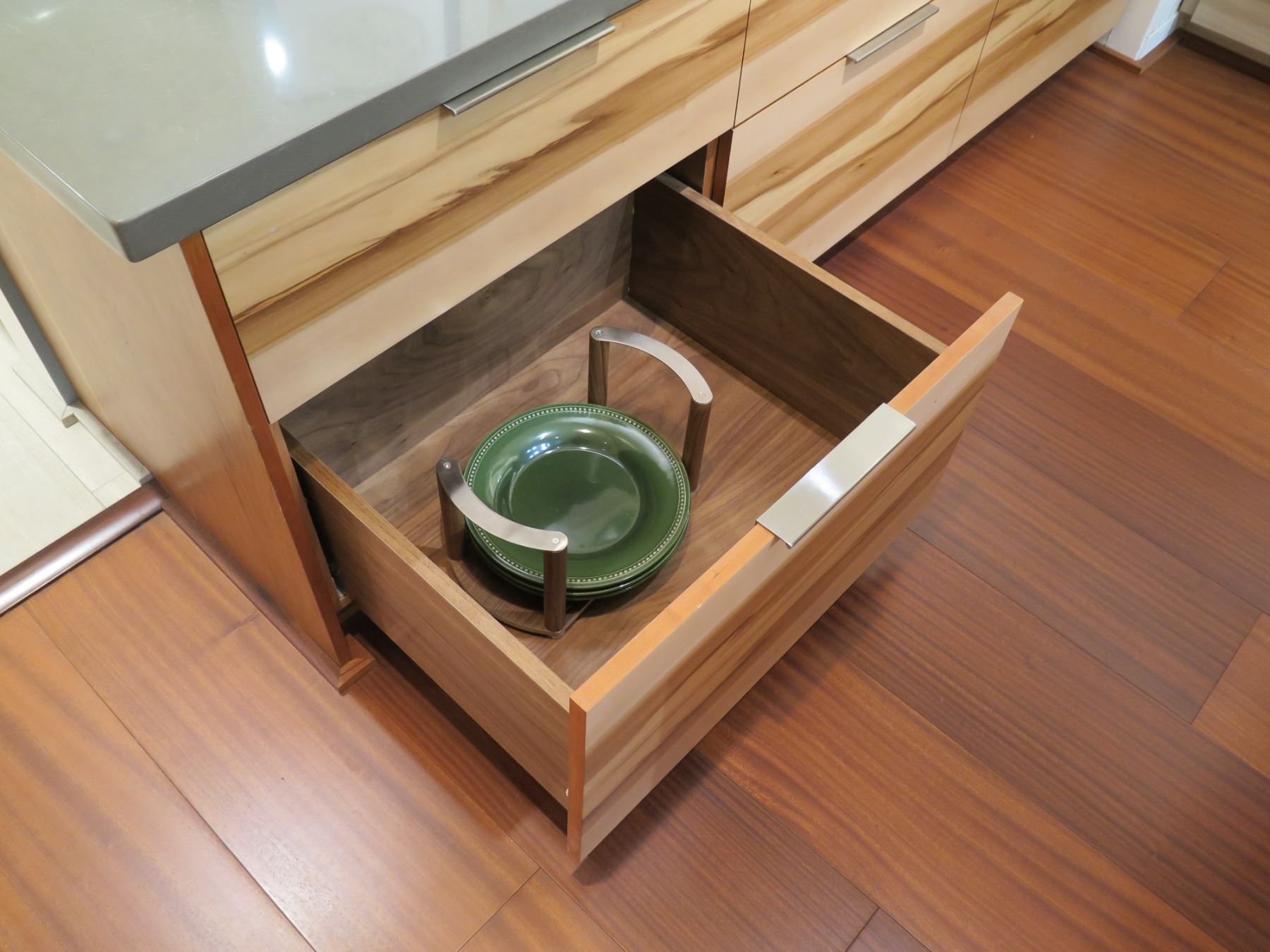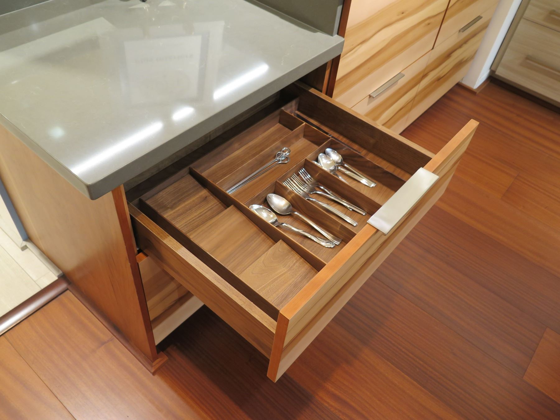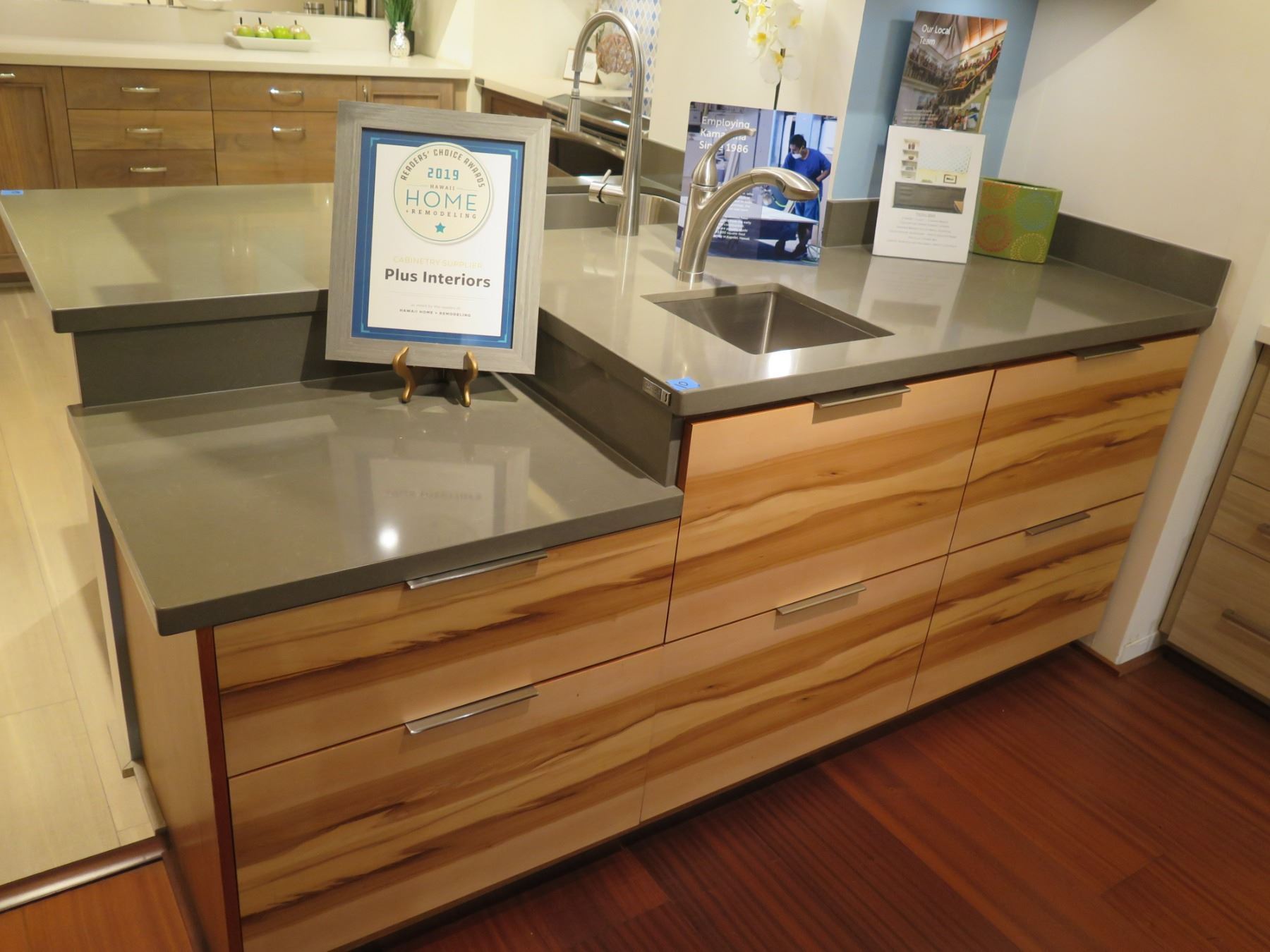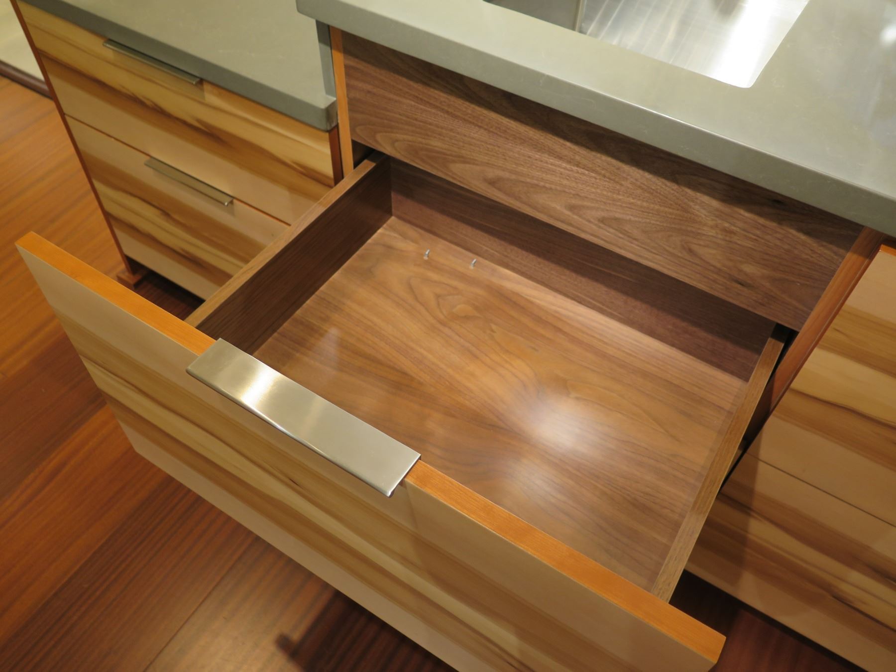 Silestone Counter, White Base & Upper Cabinets, 2 Sinks, Red Gum Drawers (dishwasher not included)