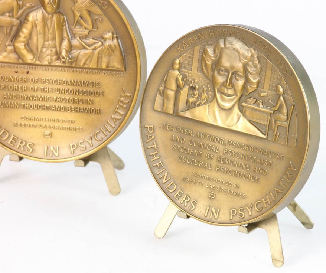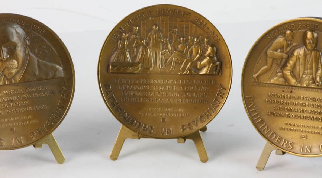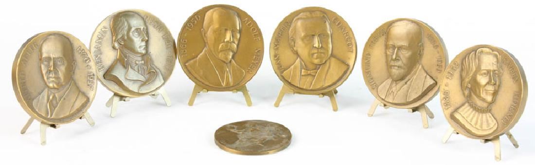 Set of six bronze medallions commemorating psychiatry. Adler, Freud, Rush, Horney, Meyer, Charcot, with stands, 3" diameter.