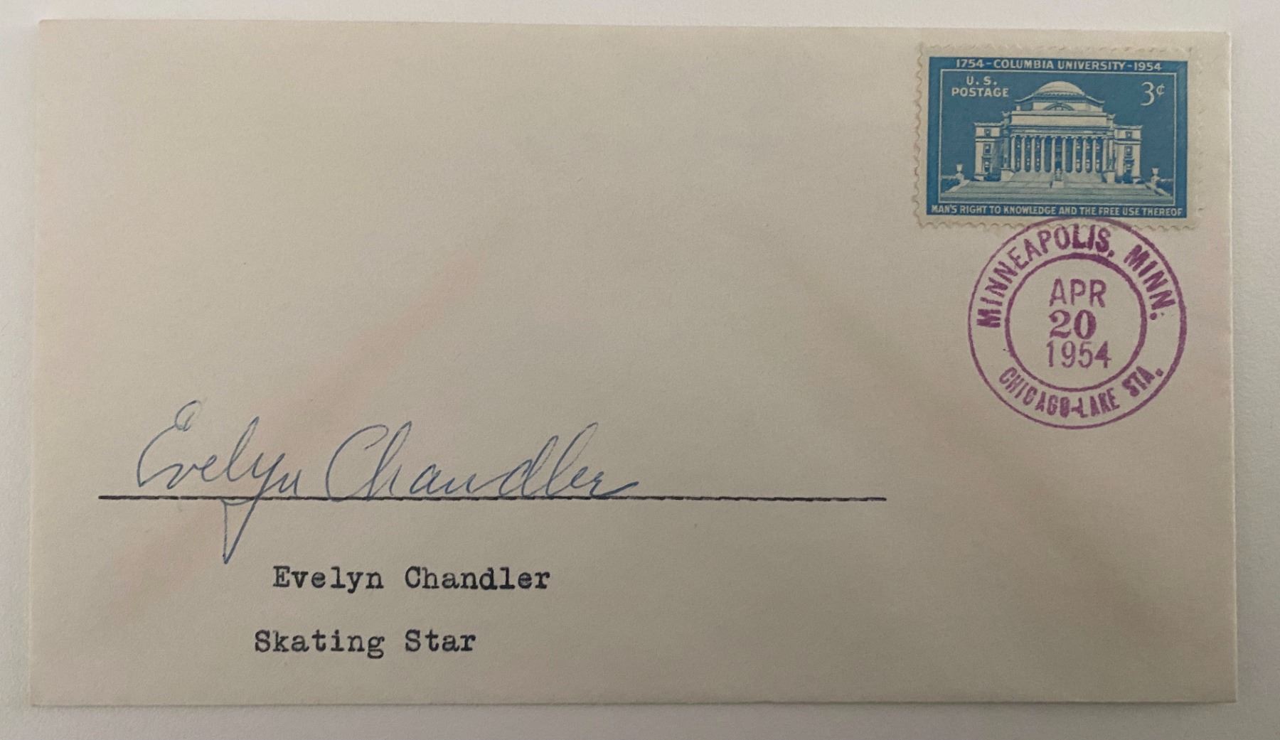 Olympic Ice Skater Evelyn Chandler signed envelope. 3x6inches