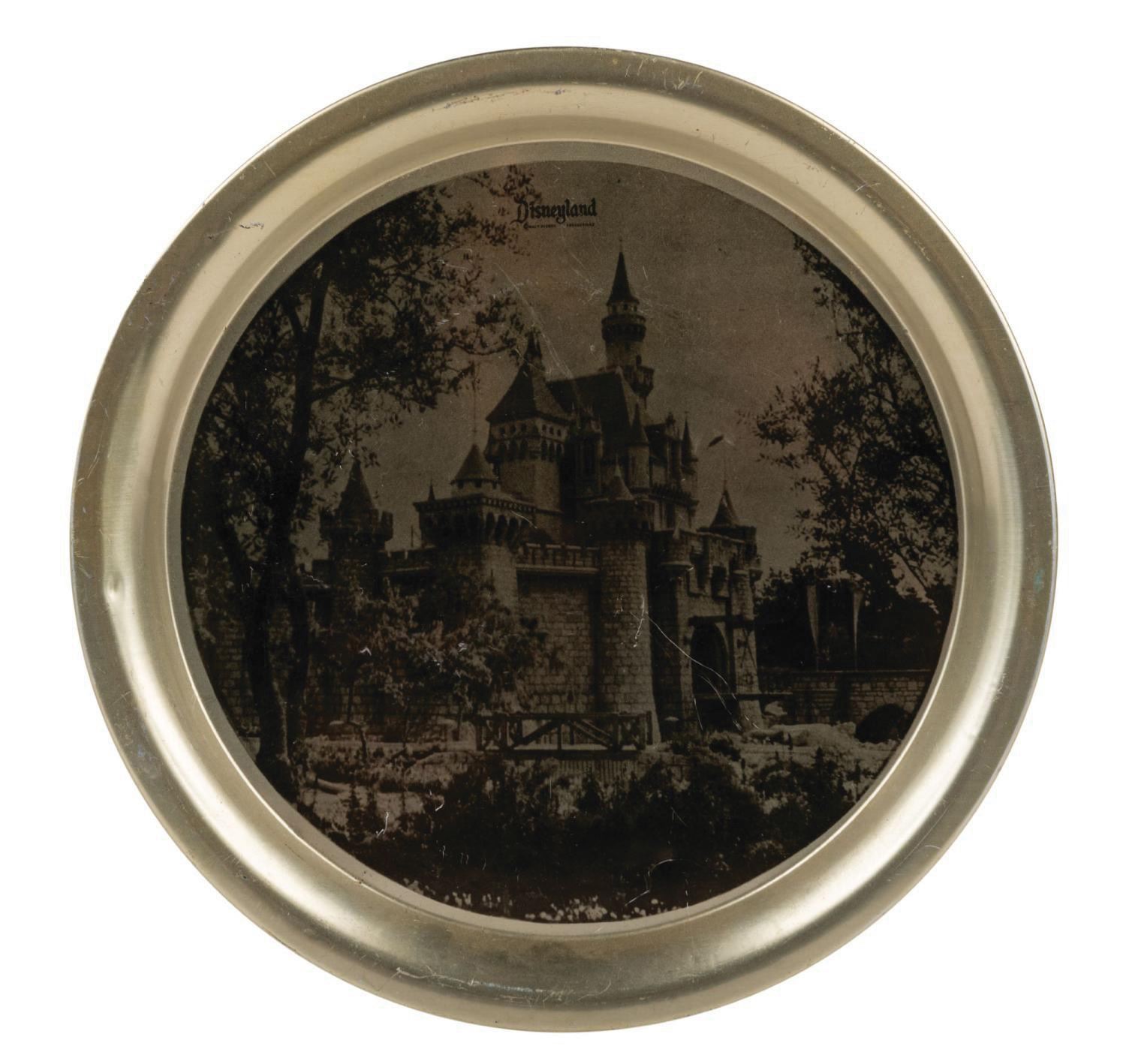 (Disneyland, c.1955) An early souvenir aluminum tray featuring lithographic photo imagery of Sleeping Beauty Castle amidst the surrounding forest of juniper, willow, melaleuca, and other trees. Measuring approximately 11" in diameter the tray displays in good condition with minor dents, scuffs and scratches throughout.