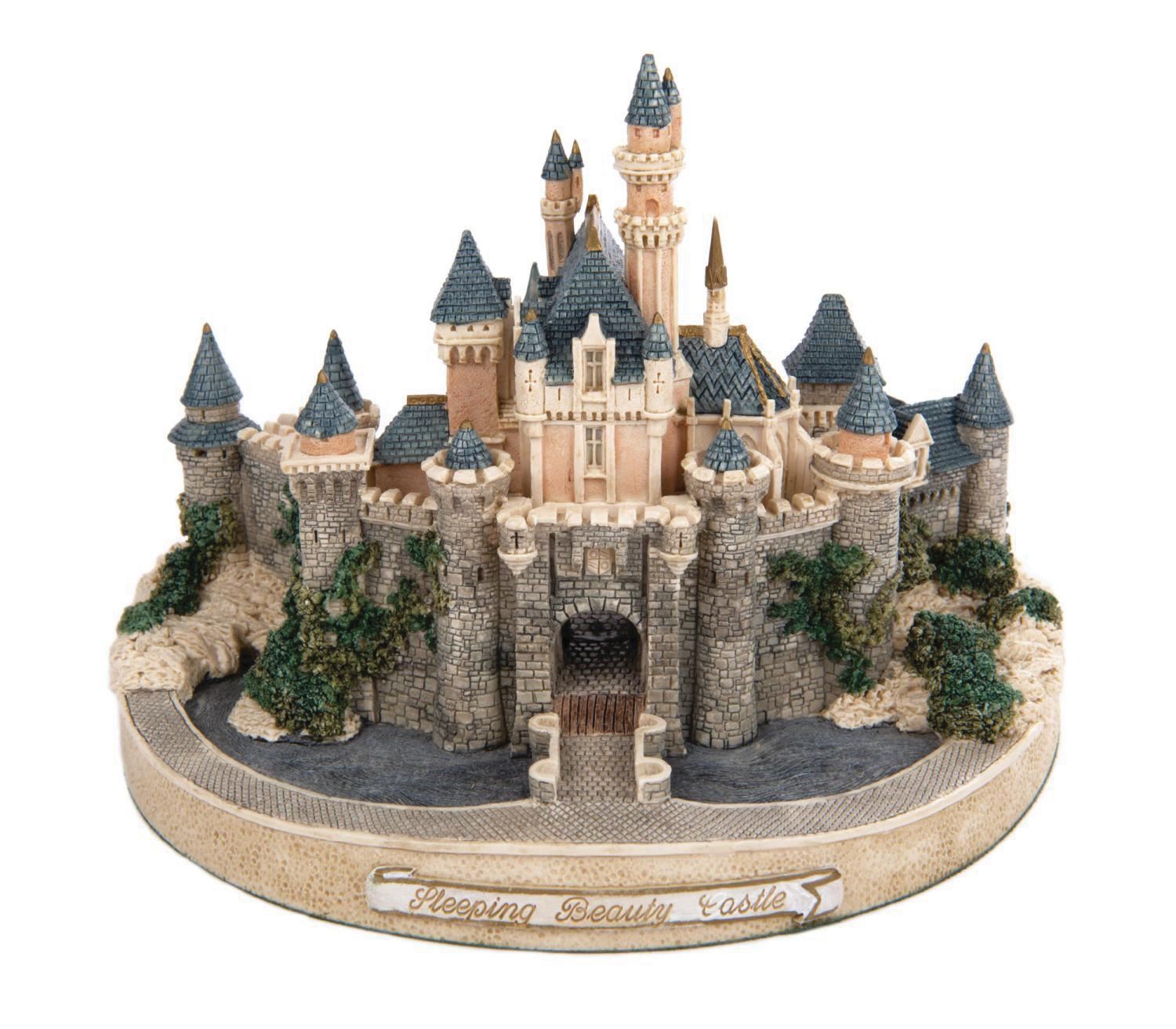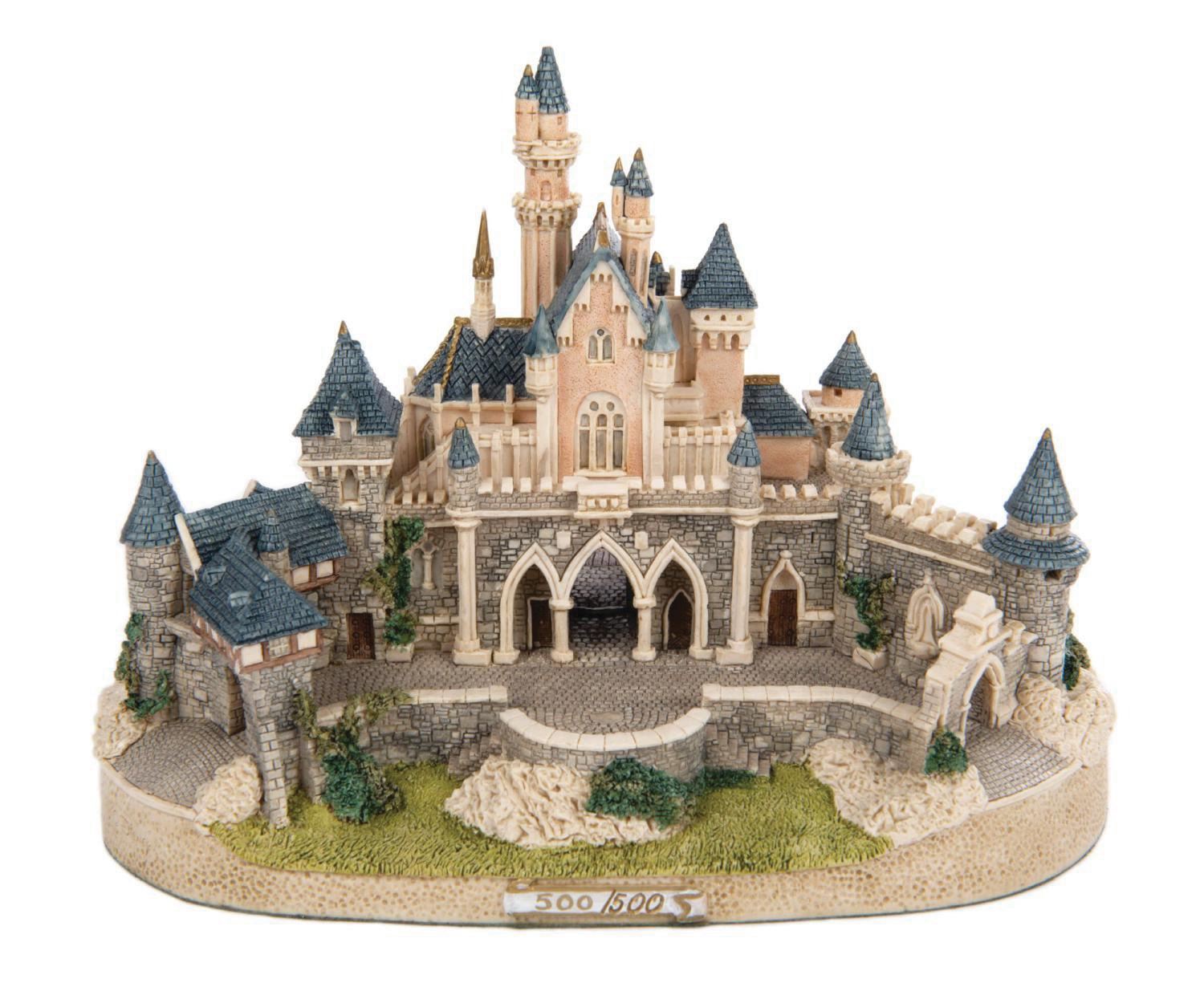 (Disneyland, 1994) A limited edition Sleeping Beauty Castle sculpture by John Hine Studios. The sculpture has been loyally crafted with a delicate palette by Bob Russell for Bob Hine Studios in England. Measuring 6" tall, on a 6.5"x8" base, the fine-condition castle is numbered 500/500 on the back, and on a label on the bottom.