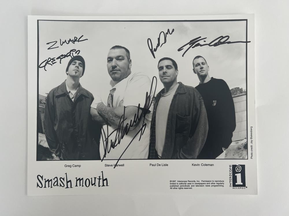 Smash Mouth signed photo autographed by Steve Harwell, Kevin Coleman, Greg Camp, and Paul De Lisle. 8x10 inches