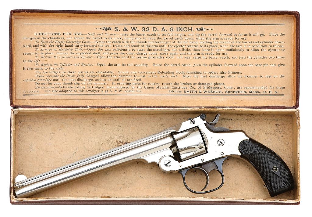 serial #205035, 32 S&W, 6'' barrel with a bright very good bore showing a ring of light pitting at the midpoint with strong rifling throughout. The metal surfaces of this Fourth Model revolver retain 98% original nickel finish, showing scattered clouding along the barrel, with a few scattered light handling marks throughout with a few scant flecks of oxidation staining. The hammer and trigger have toned to a brown patina showing muted case-hardened colors, with the rear sight latch showing scattered oxidation staining and retaining some original blue and triggerguard remaining excellent, retaining nearly all of its rich blue and showing only a few light spots of oxidation which are hardly visible to the naked eye. The checkered hard rubber grips remain excellent overall, showing minimal handling wear with a few areas of two-tone discoloration visible under direct light. Timing and lockup appear sound and the ejector functions well displaying only slight sluggishness in returning, and the rear sight latch requires higher than average force to operate. Included is the original hinged brown cardboard box, correctly end-labeled to the gun, which remains in excellent overall condition with minimal soiling or edge wear to speak of. A lovely 6'' Fourth Model made sweeter by the original box. (26A10826-381) {ANTIQUE} [Dr. W. Lloyd Hudson Jr. Collection] (1000/1500)