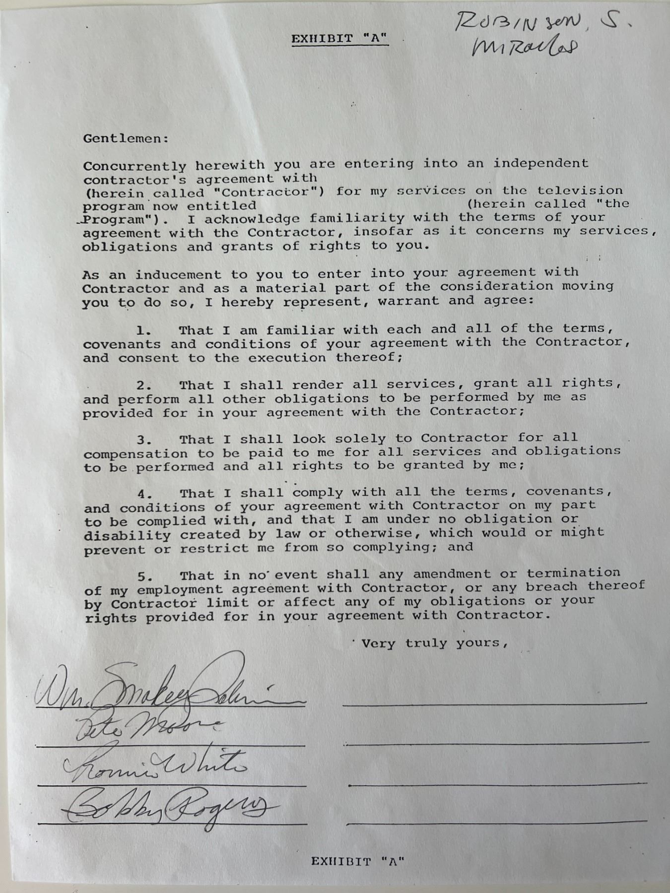 Smokey Robinson and The Miracles signed contract autographed by Smokey Robinson, Pete Moore, Ronnie White, and Bobby Rogers. 9x12 inches