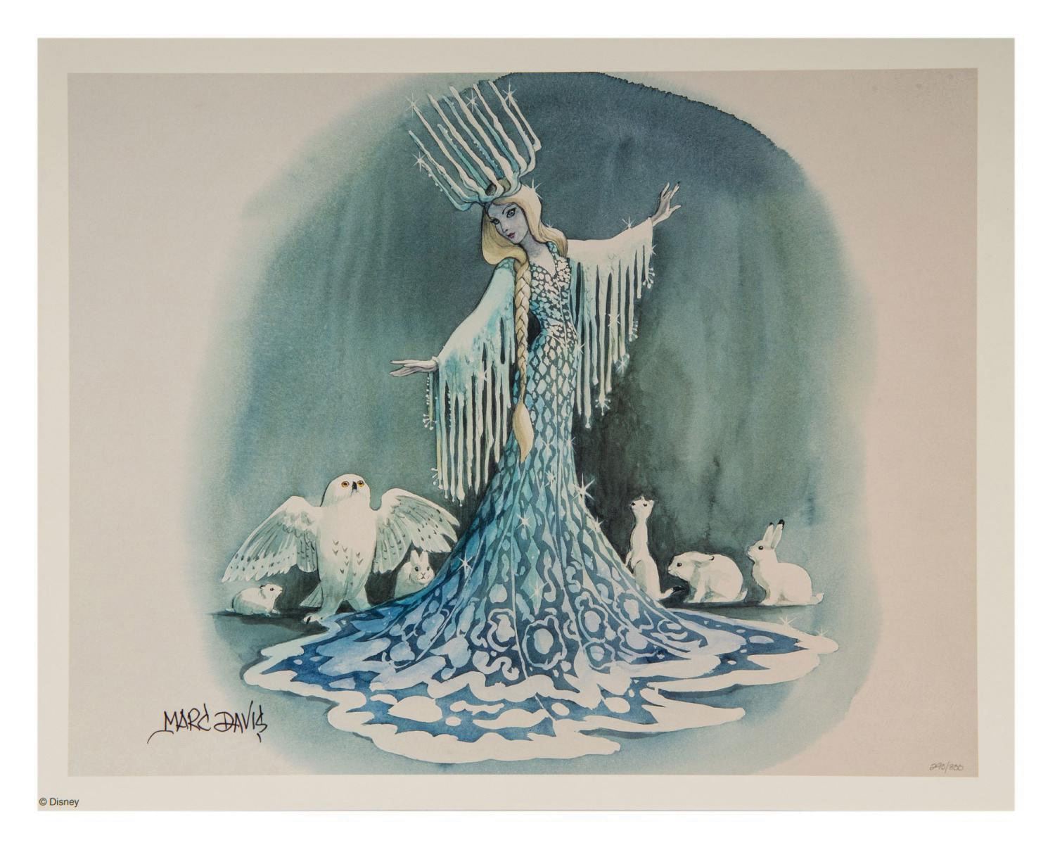 (Disneyland, 1997) A limited edition Snow Queen print signed by Marc Davis for the tenth anniversary of The Disney Gallery. The print honors Davis' designs for the proposed Enchanted Snow Palace attraction from the late 1970s. In 1997, a limited edition run of select Walt Disney Imagineering Art Library pieces were released through The Disney Gallery at Disneyland. Measuring 11"x14", the stunning print is in fine condition, and hand-numbered 290/300.