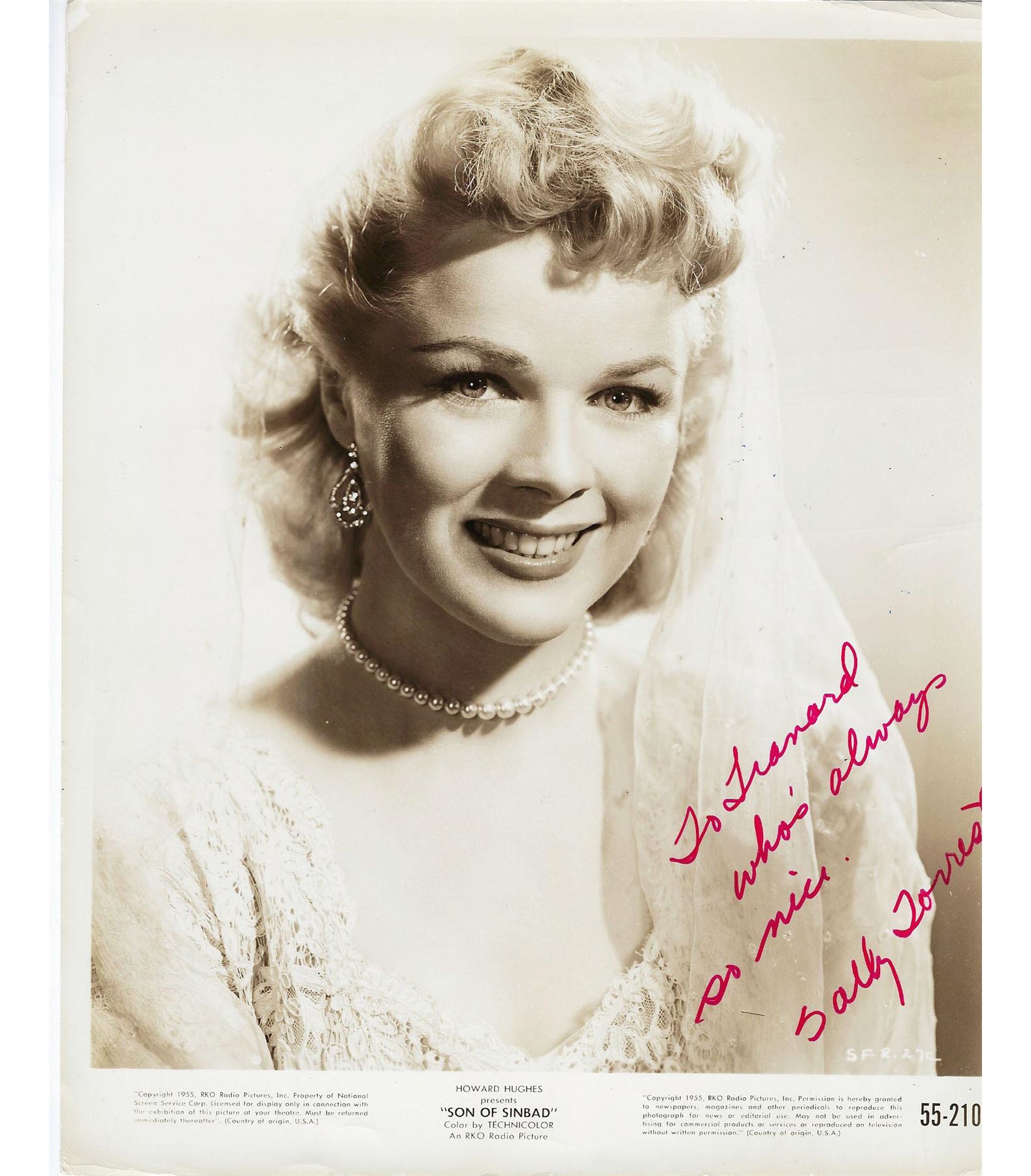 Son of Sinbad signed movie photo autographed by Sally Forrest. 8x10 inches
