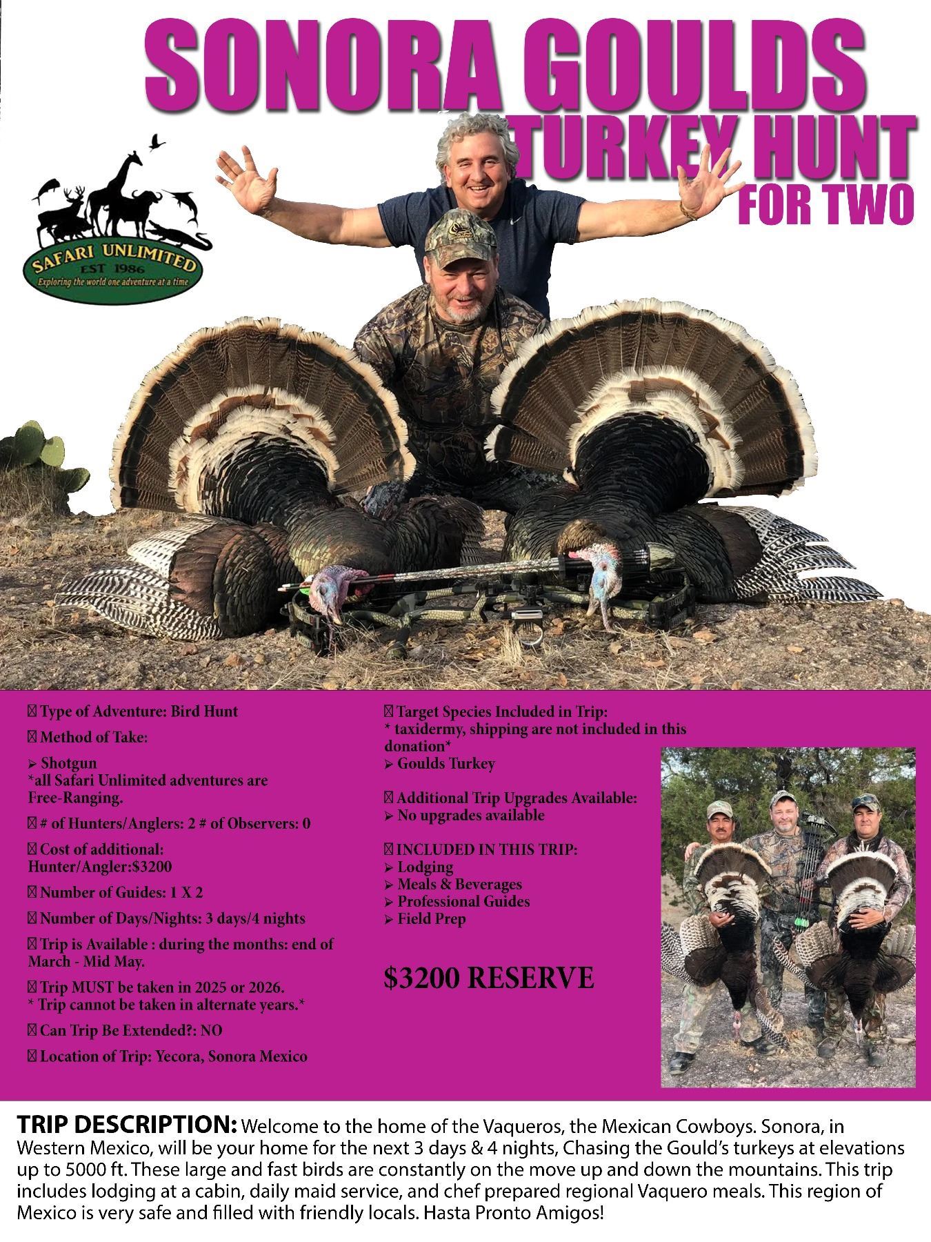 TRIP DESCRIPTION: Welcome to the home of the Vaqueros, the Mexican Cowboys. Sonora, in Western Mexico, will be your home for the next 3 days & 4 nights, Chasing the Gould’s turkeys at elevations up to 5000 ft. These large and fast birds are constantly on the move up and down the mountains. This trip includes lodging at a cabin, daily maid service, and chef prepared regional Vaquero meals. This region of Mexico is very safe and filled with friendly locals. Hasta Pronto Amigos!