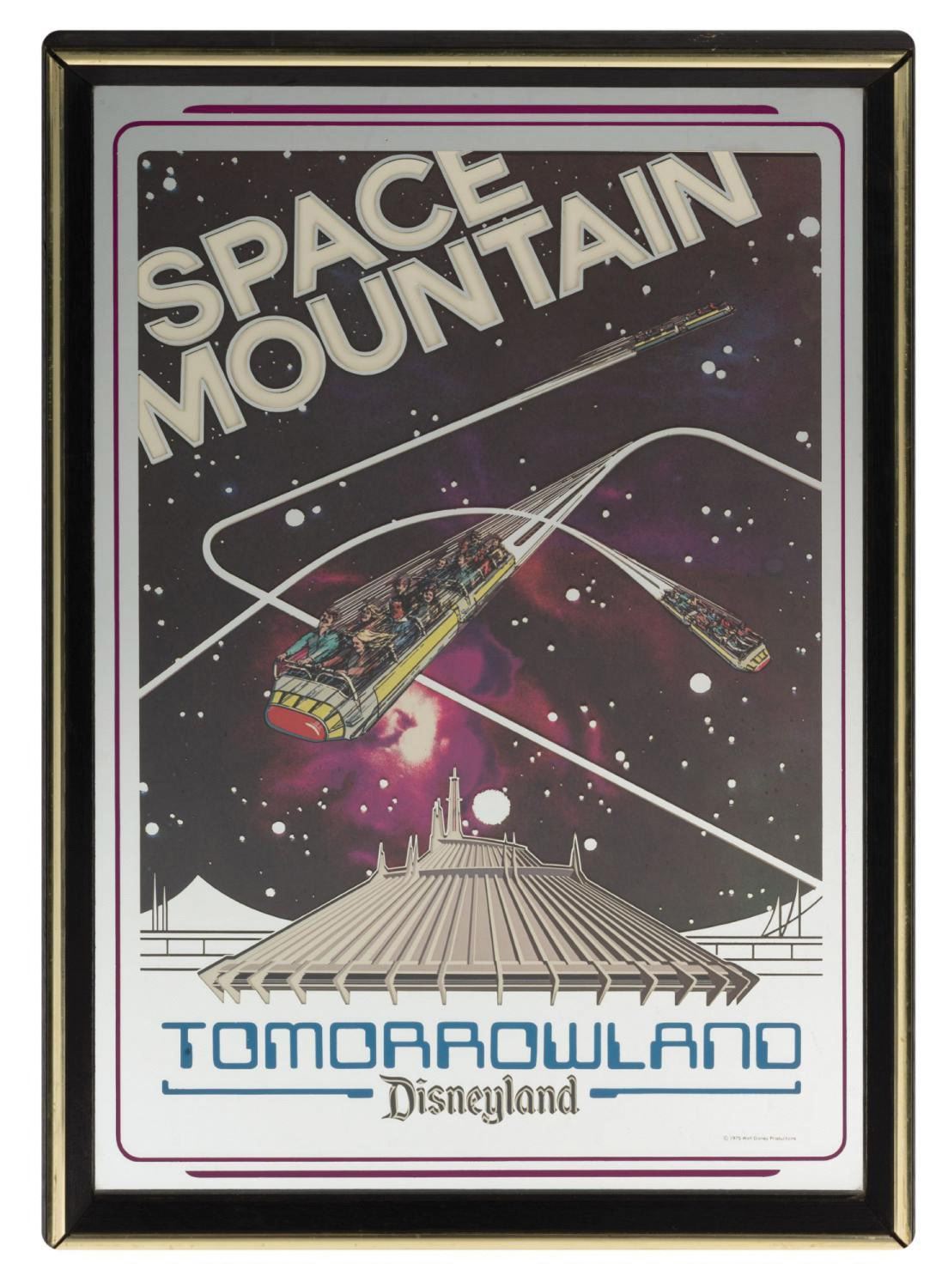 (Disneyland, 1975) A souvenir mirror featuring the poster imagery for Space Mountain. During the 1970s, a series of framed Disneyland souvenir mirrors were sold at Disneyland which replicated the poster imagery of some of the Park's most popular attractions. Measuring 13.5"x19.5" within its original frame, the mirror displays in very good condition, with minor wear to the frame from previous display.