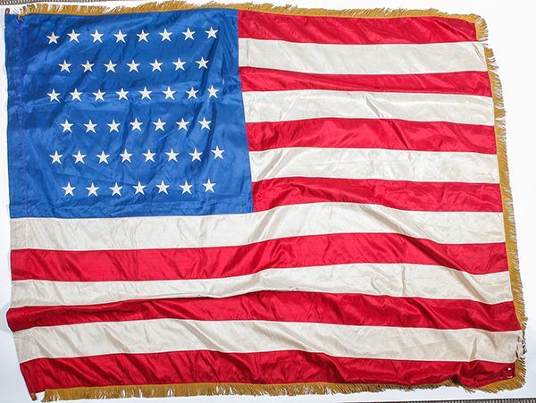 Utah became the 45th state in 1896. The 45-star flag was used from then until 1907 when Oklahoma became a state. This was a patriotic period because the Spanish American War took place in 1898. A flag like this one was raised following the successful assault on San Juan Heights, made famous because of the participation of Teddy Roosevelt and his Rough Riders. Ex Claude Harkins Collection.