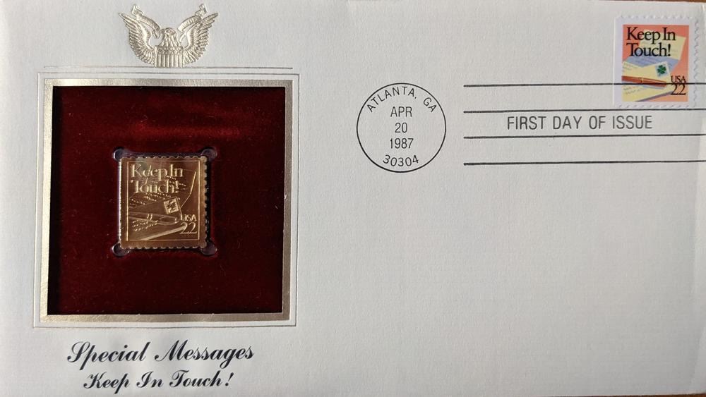 Special Messages Keep In Touch Gold Stamp Replica First Day Cover. Atlanta, GA Apr. 20 1987