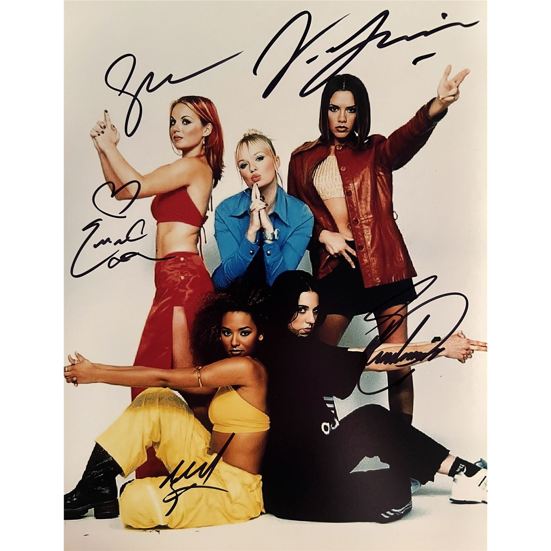 Spice Girls band signed photo autographed by Victoria Beckham, Mel B., Melanie C., Geri Halliwell and Emma Bunton. 8x10 inches