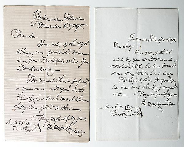 Spinner, Francis E (1802-90) American politican appointed by President Lincoln as Treasurer of the United States (1861-75); he was the first federal administrator to hire women. Two autograph letters signed ("F.E. Spinner"), 1 page each, 8 x 5 in., Jacksonville, Florida, 1875 and 1876. Responding to requests for Spinner's inimitable autograph, which he developed to prevent counterfeiting. Minor ink brushing in one letter, else fine.