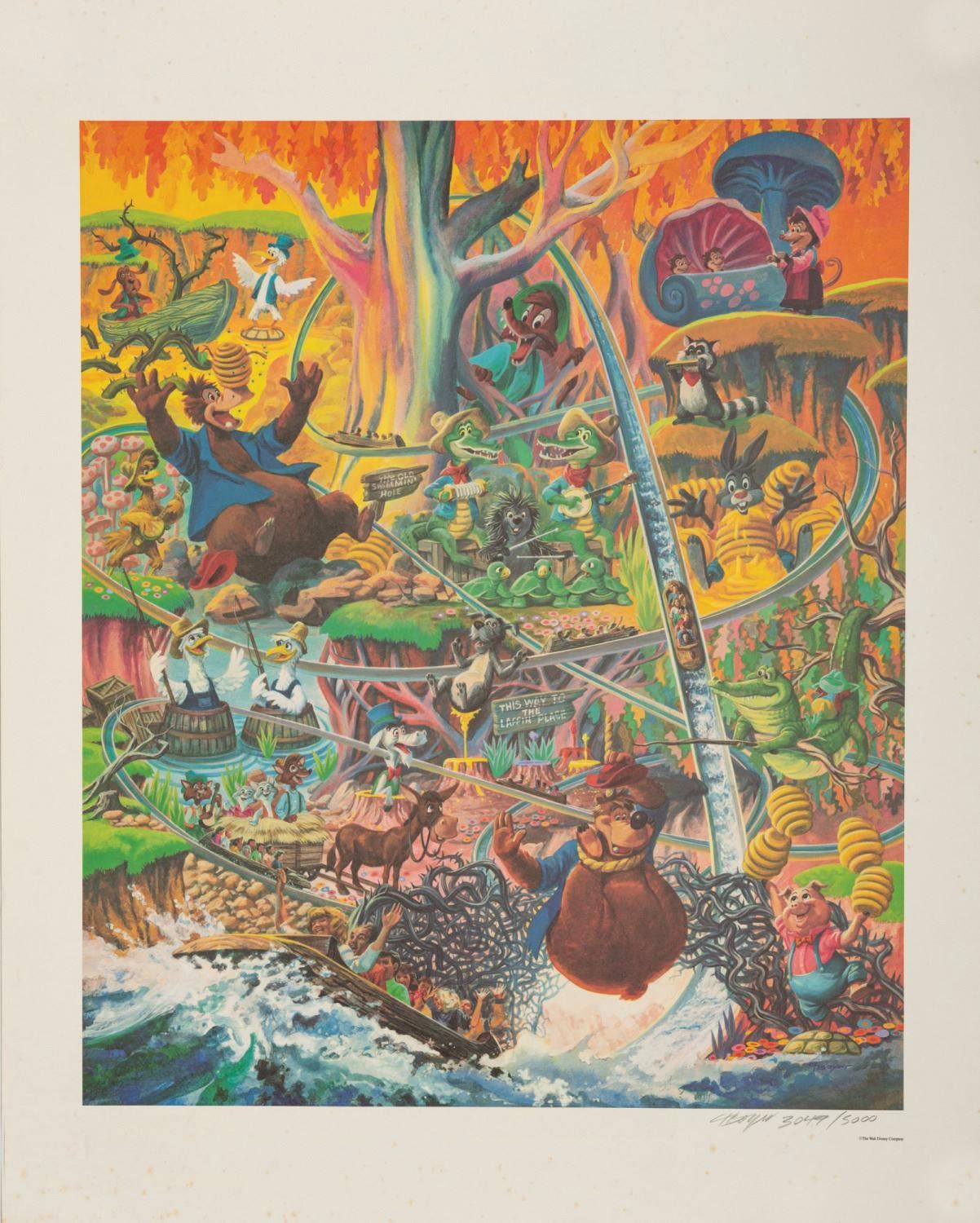 (Disneyland, 1989) A limited edition signed lithographic print by Charles Boyer, created to commemorate the opening of Splash Mountain at Disneyland. The lithographic print is titled "The Laffin' Place" and is signed by Boyer in the bottom-right corner. Measuring 30"x24", the lithograph numbered 3,049/5,000 displays in fair condition with some wear along the margins, including scattered spots of discoloration.