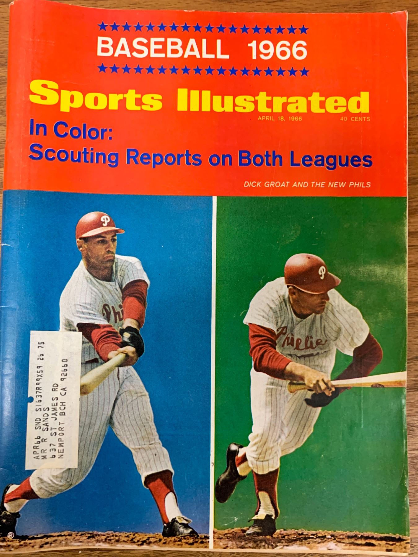Sports Illustrated Baseball 1966, In Color: Scouting Reports On Both Leagues. Cover featuring Philadelphia Phillies Dick Groat (24) in action, at bat during spring training in Clearwater, FL. April 18, 1966 issue.
