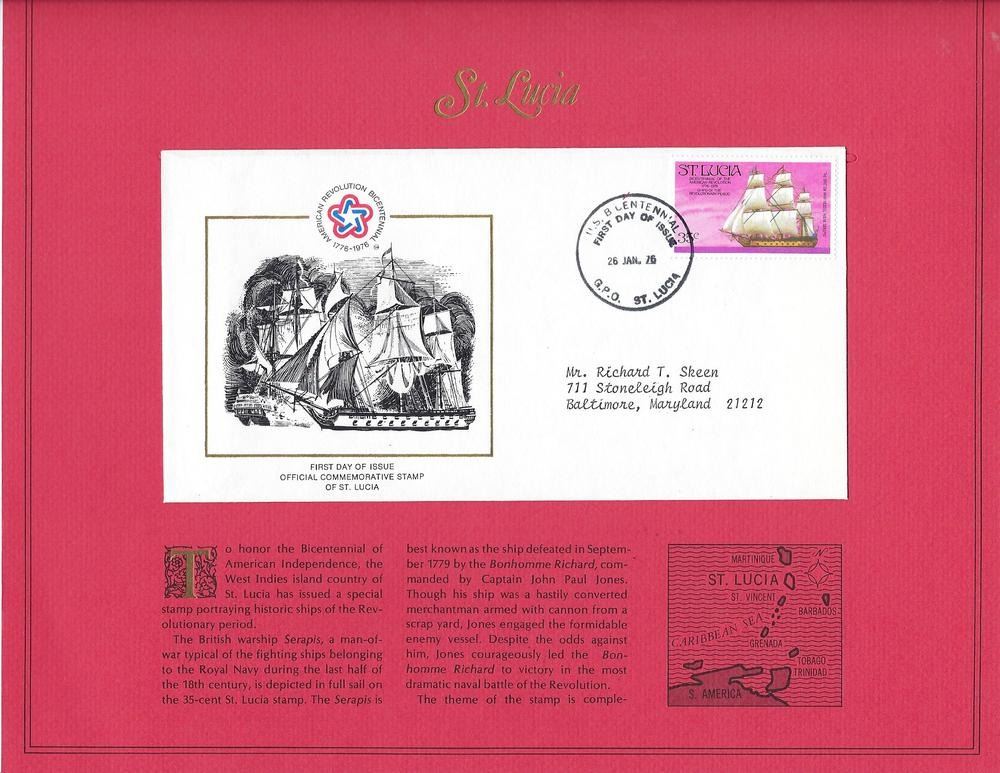 St. Lucia - American Bicentennial Commemorative FDC - 26 Jan 76 - St. Lucia has commemorated the Bicentennial of American Independence with the issuing of a Special Commemorative Stamp on a Limited Edition First Day Cover