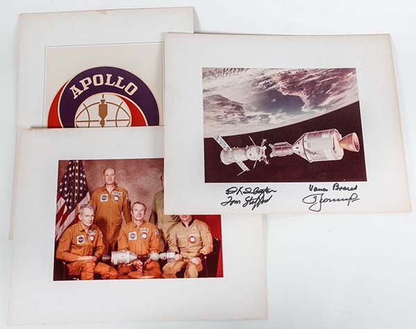 Stafford, Brand, Slayton & Leonov Autographs. On the mat surrounding a photo of an illustration showing the Apollo and Soyuz capsules about to dock. The photo measure 9.5 x 7", the mat 14 x 11". Boldly signed. Attractive. Also included are 2 other unsigned mounted photos. One is an official ASTP crew photo and the other photo is of an ASTP mission logo. Ex. the Astronaut Donald K. "Deke" Estate Collection.