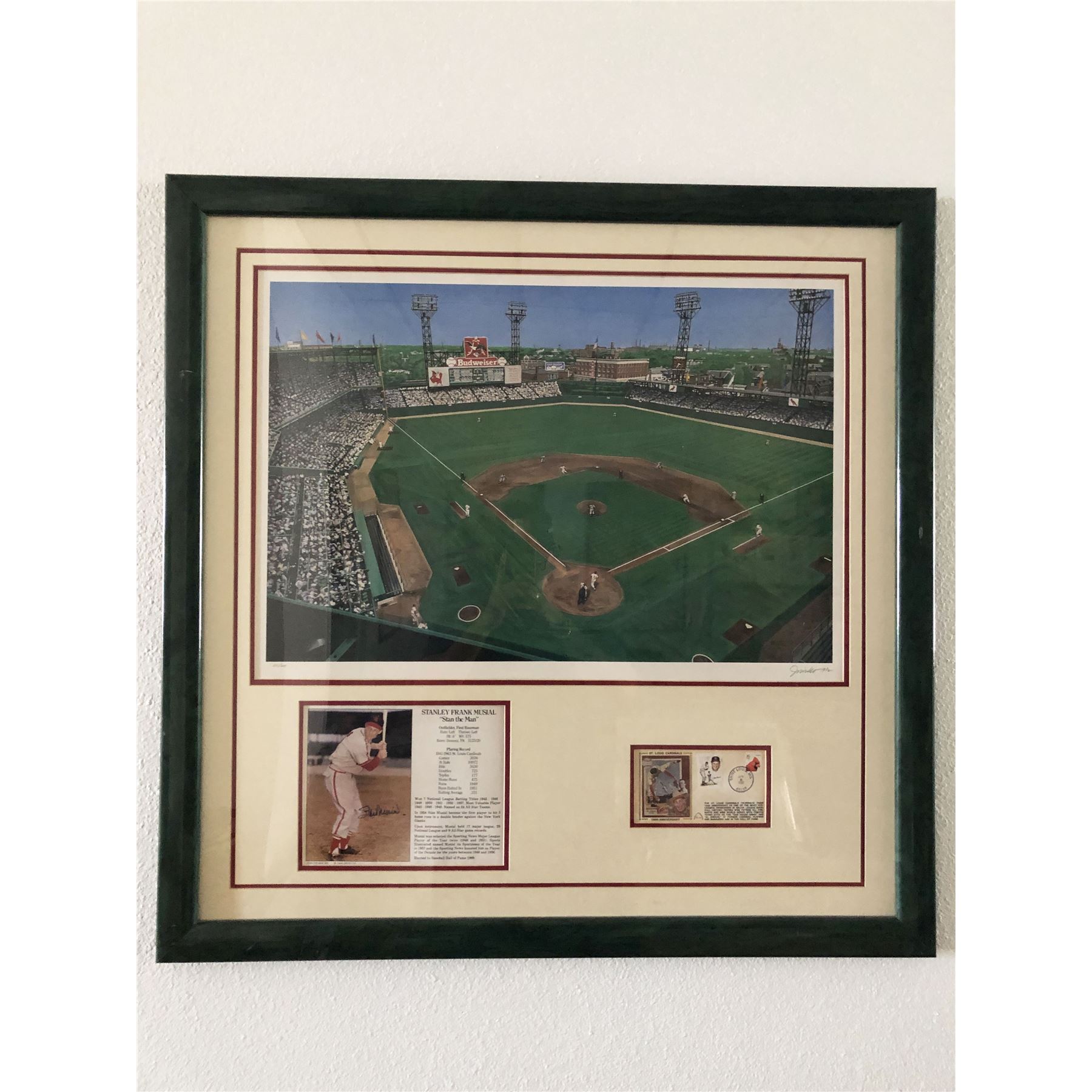 Stan Musial signed photo collage. Custom framed with Busch Stadium limited edition litho and First Day Cover. 37x38 inches. This piece does have some wear and tear on the frame.