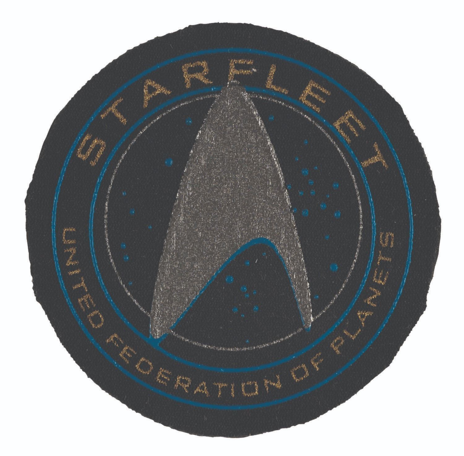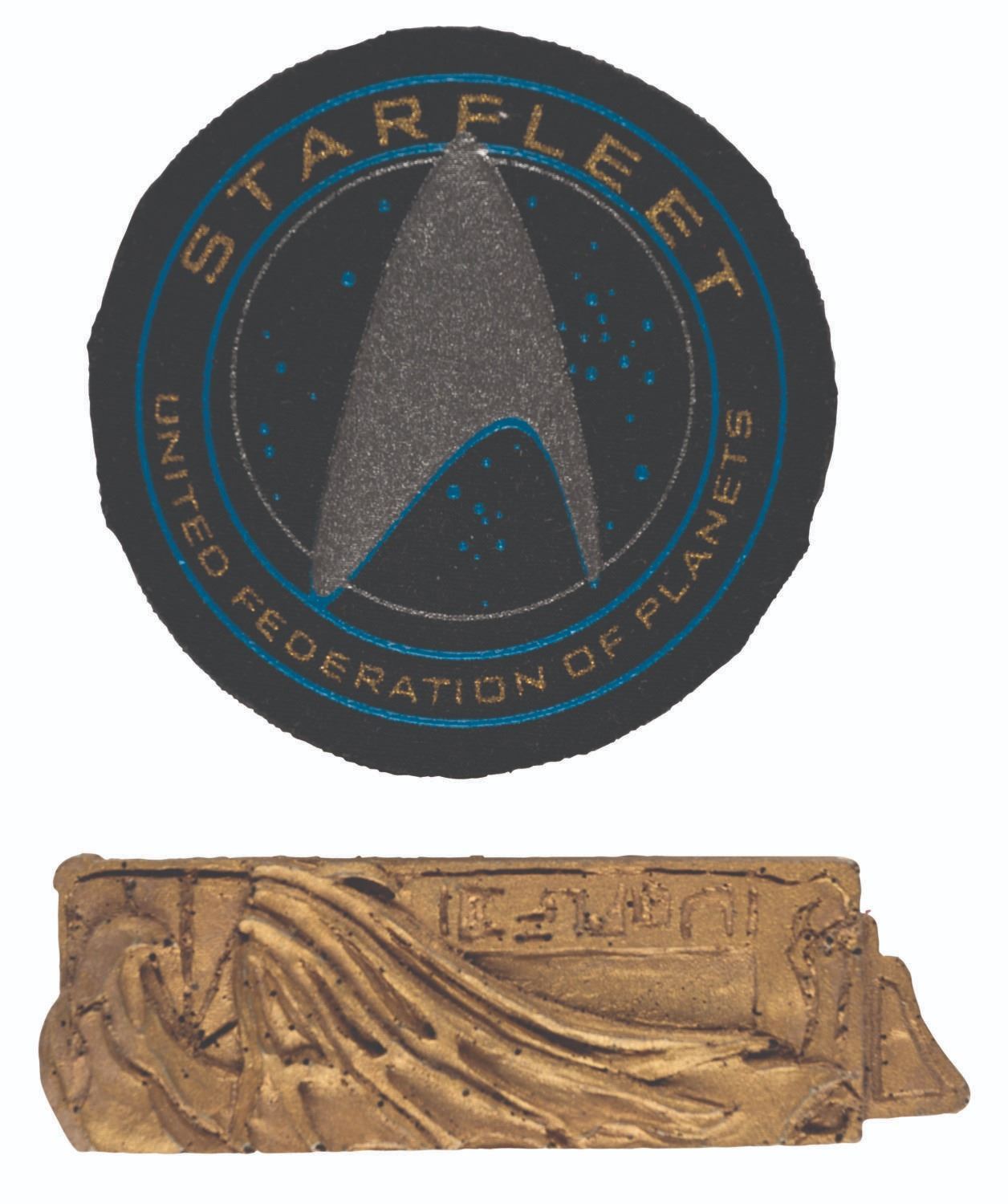 (Paramount, 1990s-2013) A prototype Starfleet costume patch from the film "Star Trek: Beyond,” and a Romulan communicator badge from television. In the J.J. Abrams film, this patch is seen on the landing party uniforms of both Kirk and Chekov. The Communicator Badge was part of the Romulan uniform seen in "The Next Generation,” "Deep Space Nine,” and "Voyager.” It typically had a silver or copper hue on screen, matching the accents of the uniform it was worn with. This may be a sample from an unused gold uniform, a color test, or a background character from the "Deep Space Nine” episode "Inter Arma Enim Silent Leges,” in which many variations of Romulan dress appear with communicators. The patch which is screen print on foam measures 3” in diameter and is in fine condition. The resin-cast communicator badge measures 3.75” x 1.25” wide” x 0.25” thick and displays in very good condition with light paint loss on the edges and velcro on the reverse from production use.