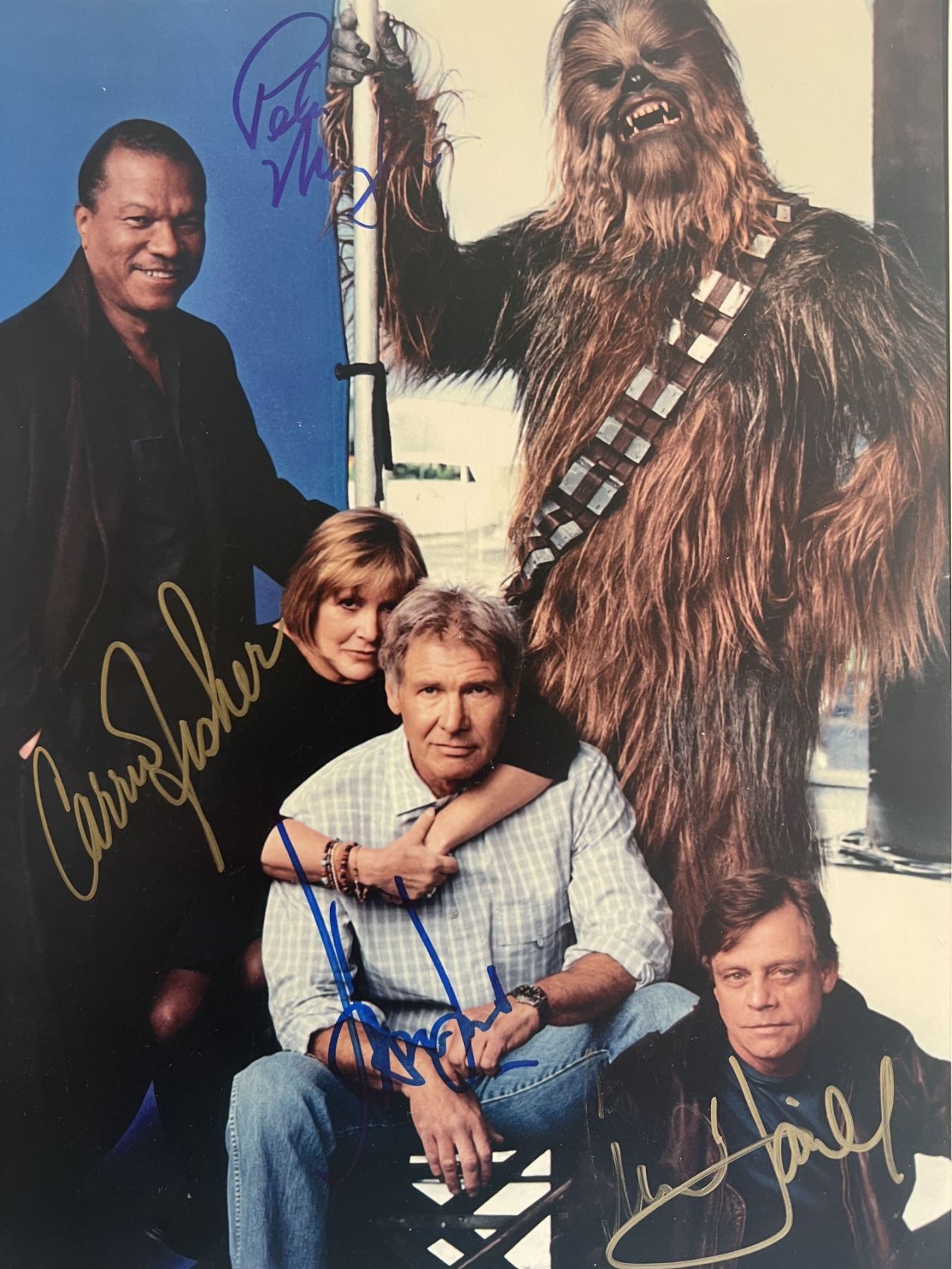 Star Wars Force Awakens cast signed photo autographed by Harrison Ford, Carrie Fisher, Peter Mayhew and Mark Hamill. 8x10 inches