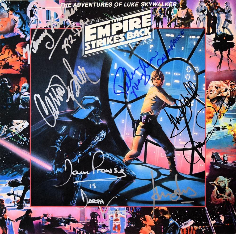 Star Wars The Empire Strikes Back signed soundtrack album. Signed: Dave Prowse is Darth Vader, Mark Hamill, Peter Mayhew Chewbacca, Harrison Ford, Anthony Daniels C-3PO, Carrie Fisher & Kenny Baker R2-D2.
