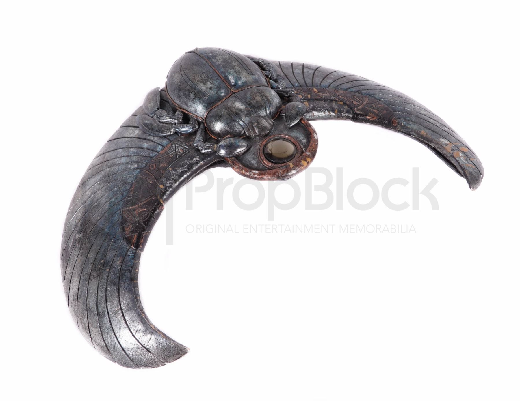 Prototype belt made for use by Ra in the 1994 motion picture Stargate. This piece started as a concept design for the glider featured in the film, and was re-used to create a belt buckle that was ultimately not used by the main villain. Made of dense foam latex, this piece features a metallic green paint scheme with hues of yellow, dark green and rust. The item features a hard fiberglass bottom with attached metal bolts. This item remains in excellent, production made condition.