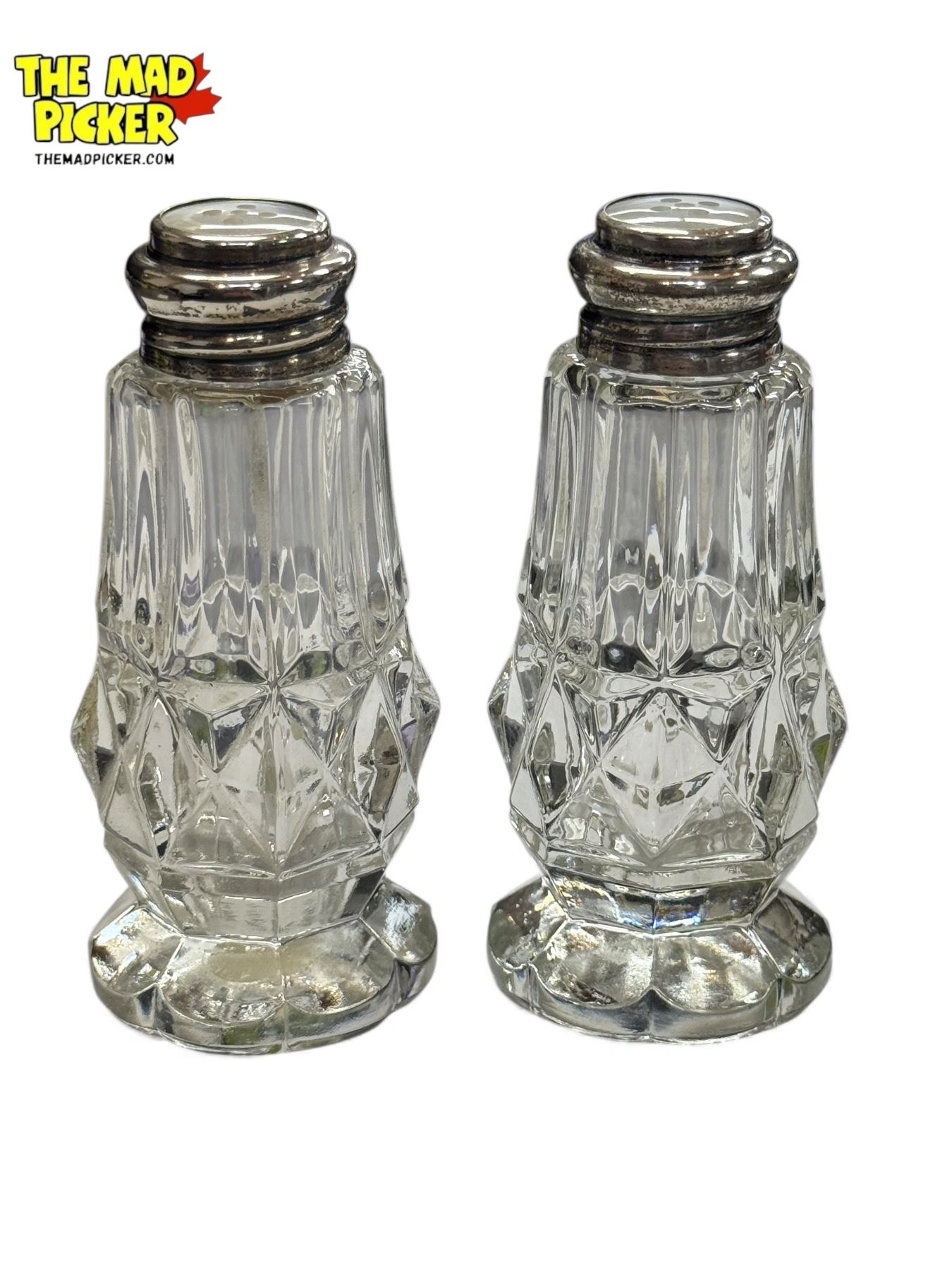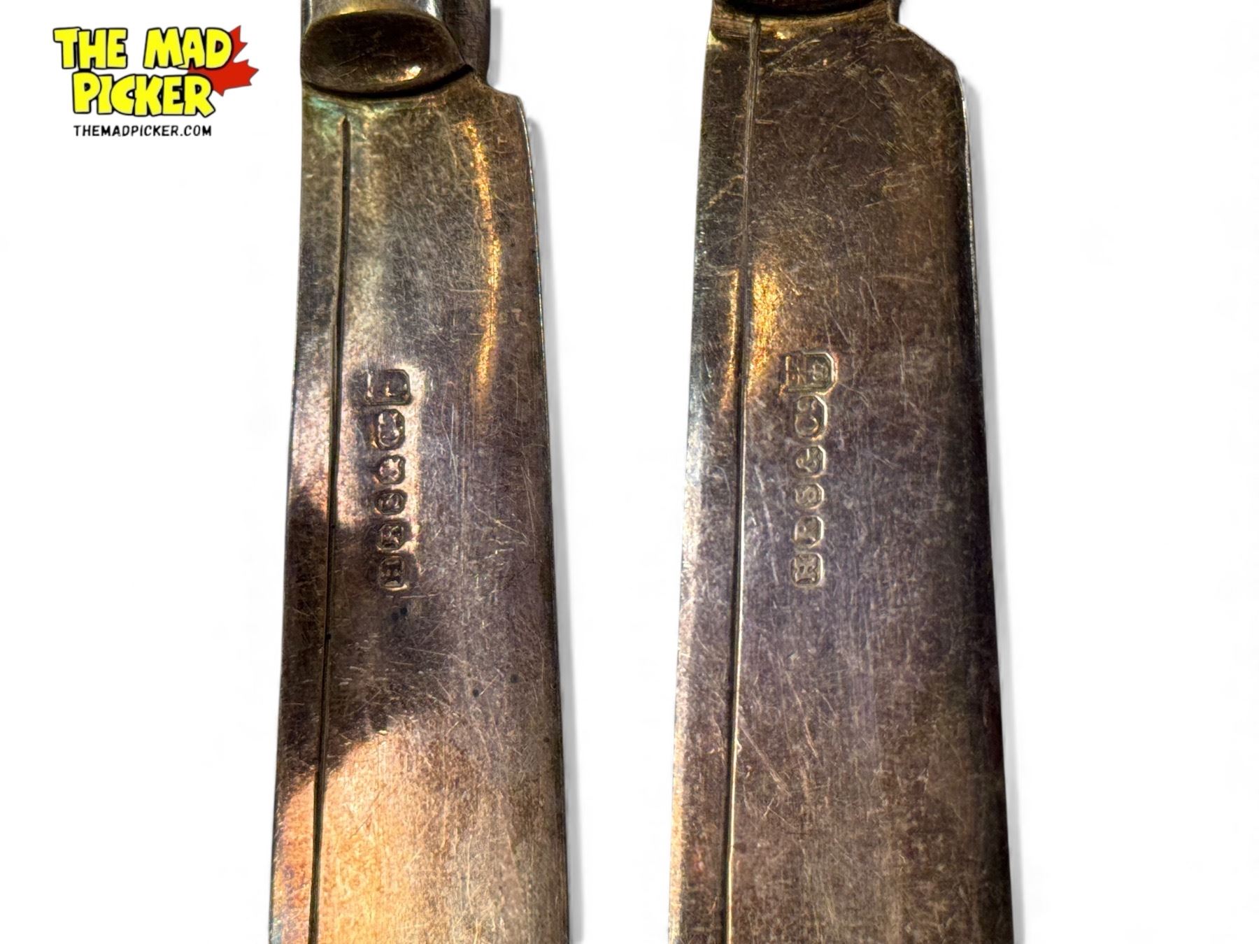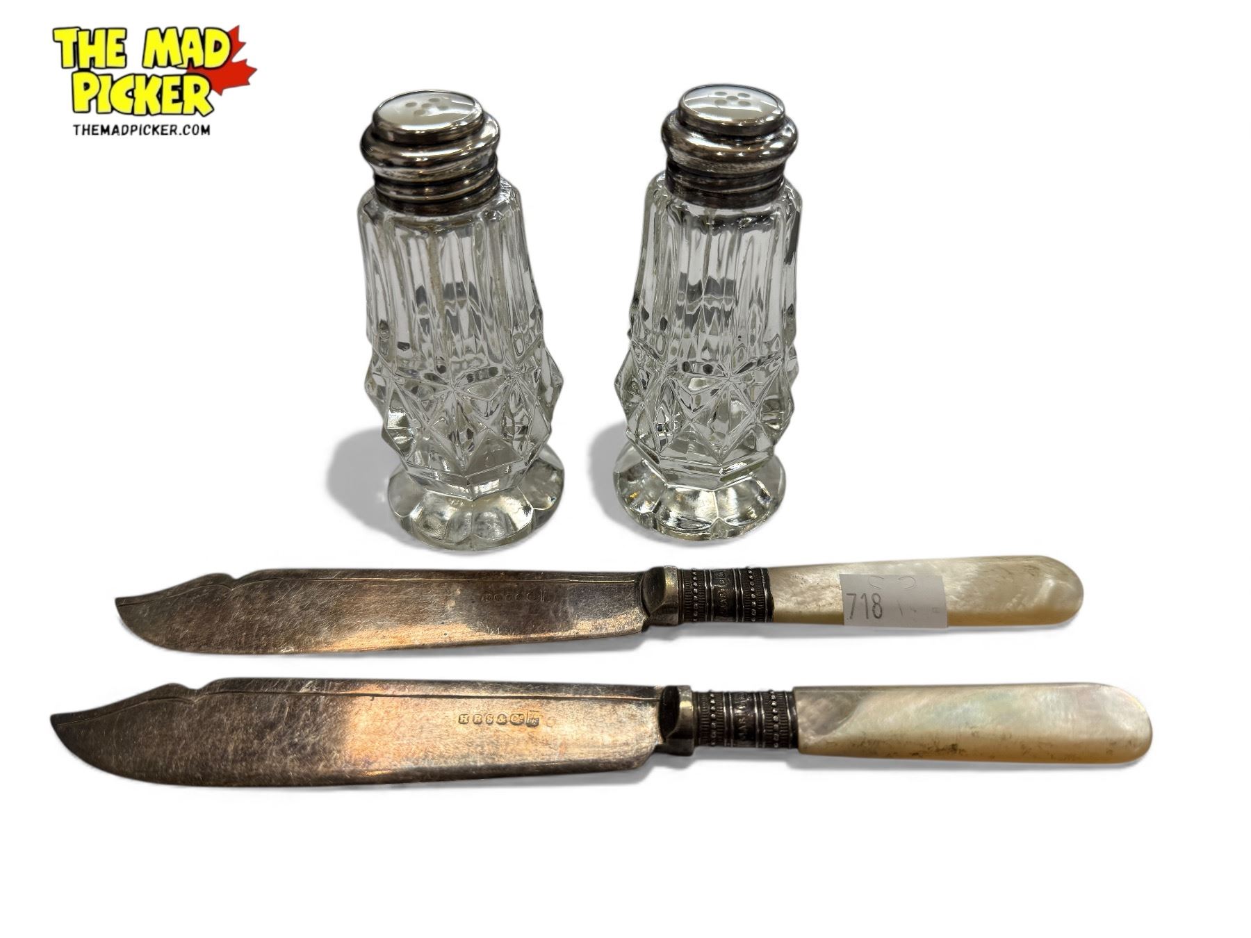 Sterling Collectibles:Salt + Pepper Silver Lidded Shakers & JAS Lion Hallmark Collar Mother Of Pearl Knives