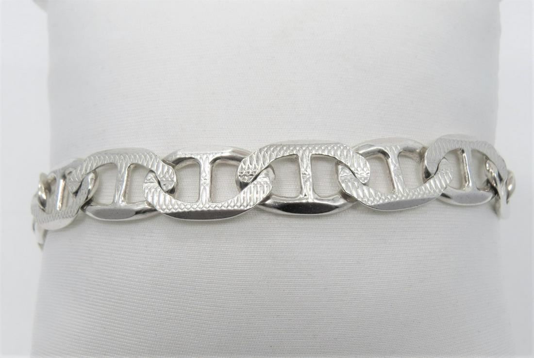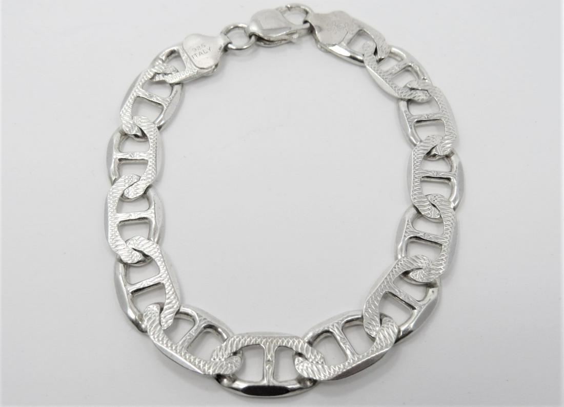 Stamped 925 sterling silver men's textured mariner link bracelet. 7.5" length. 10.5 mm width. Large lobster claw clasp. 22.7 grams.