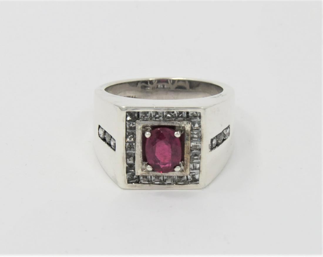This is a large sterling silver men's ring set with white square-cut stones in a channel-set halo around a large, oval-cut red center stone. Flanked by white round stones. This