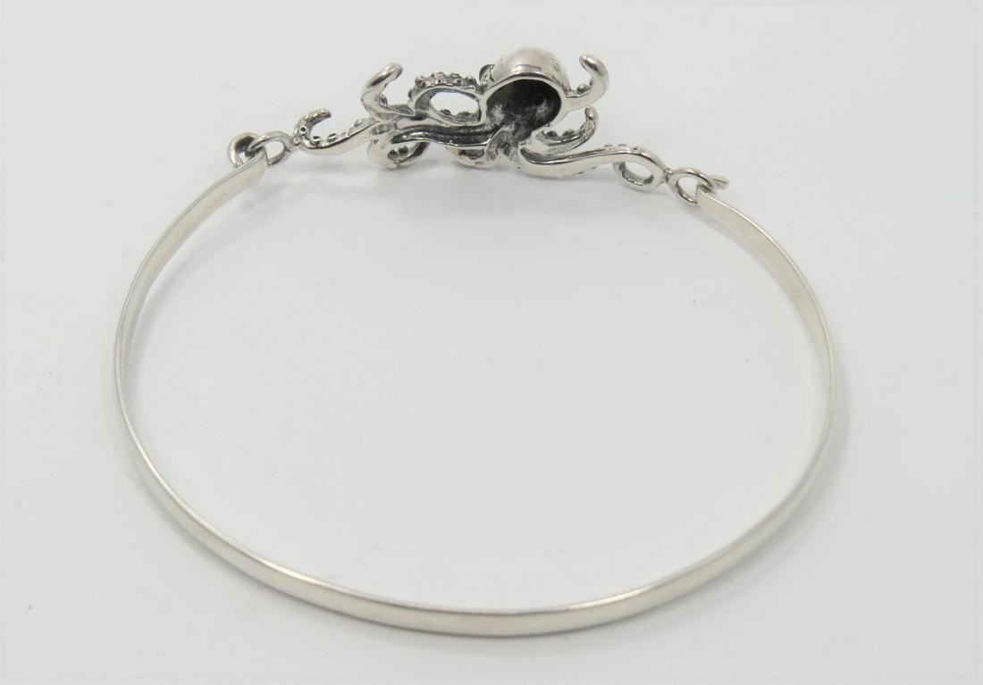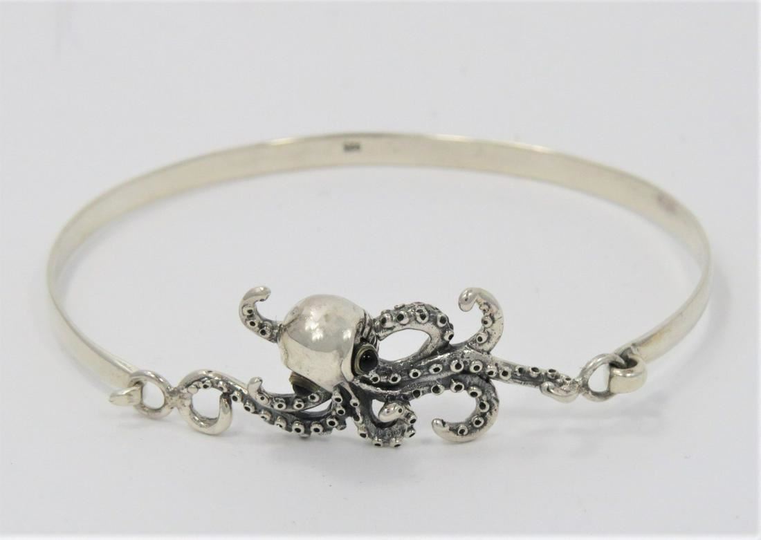 Sterling silver ladies hinged bangle bracelet featuring a figural octopus clasp. The octopus has black onyx cabochons set into it's eyes. The piece weighs 10.3g and measures 11.8mm at it's widest point.